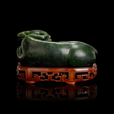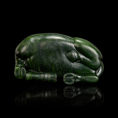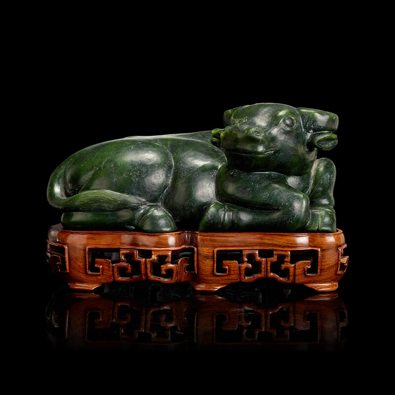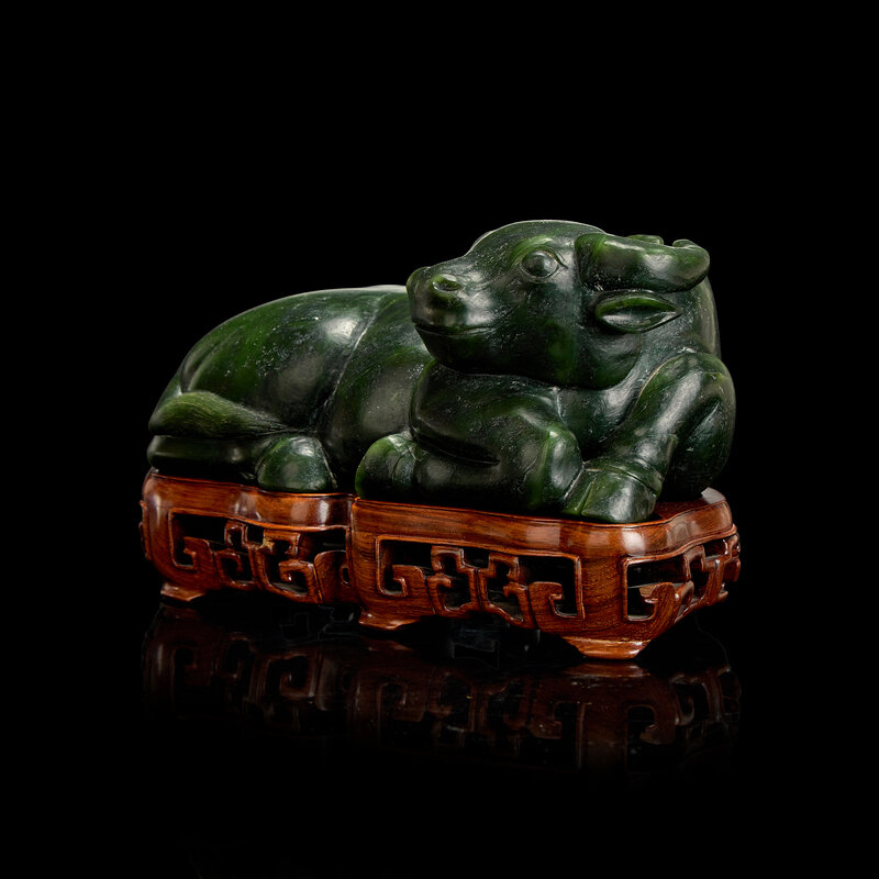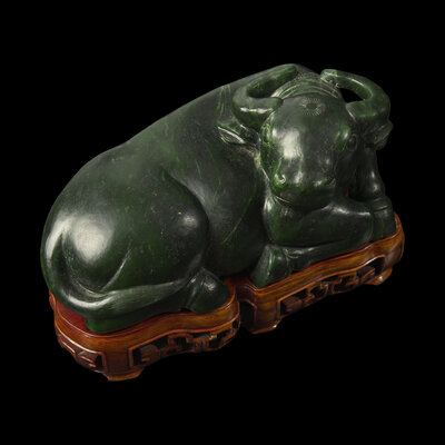The buffalo in recumbent posture, carved with pleasing expression; the stone of a rich, slightly varied dark green tone; modern wood stand.