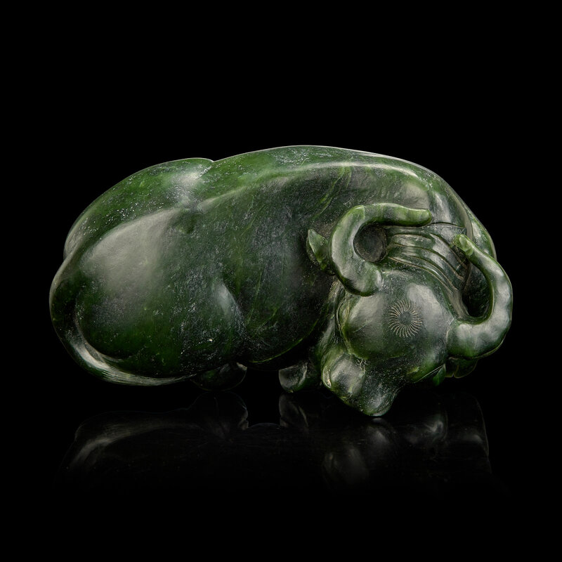 A Chinese Spinach Jade Buffalo, Qing Dynasty