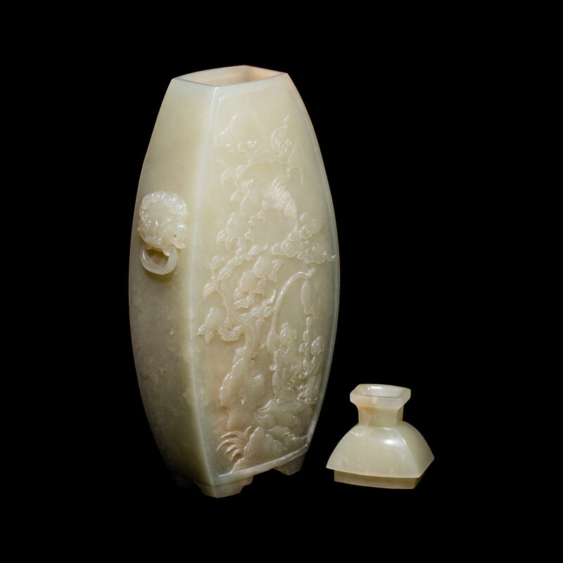 The rectangular sectioned vase with softly rounded edges above four bracket feet, carved to both larger sides in relief depicting boys at play underneath peaches, bats, clouds and pheasants on flowering prunus trees, the two narrow sides decorated with a pair of beast mask-form handles, the domed cover topped with a rectangular form finial.