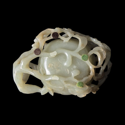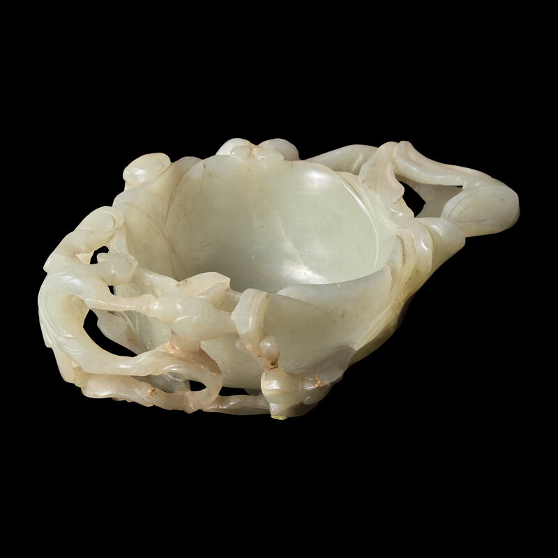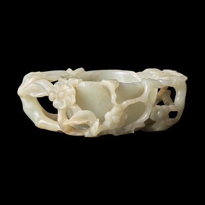 The jade cup is carved as a blossom among openwork branches and foliage.