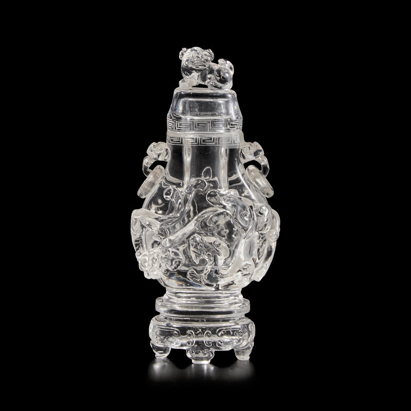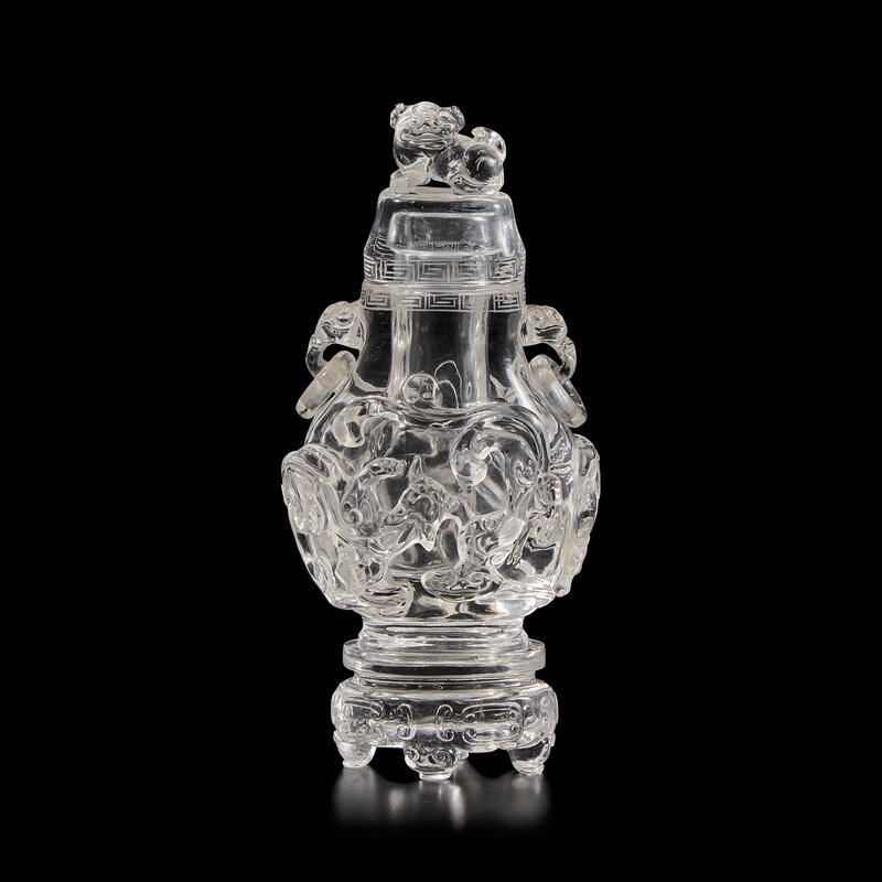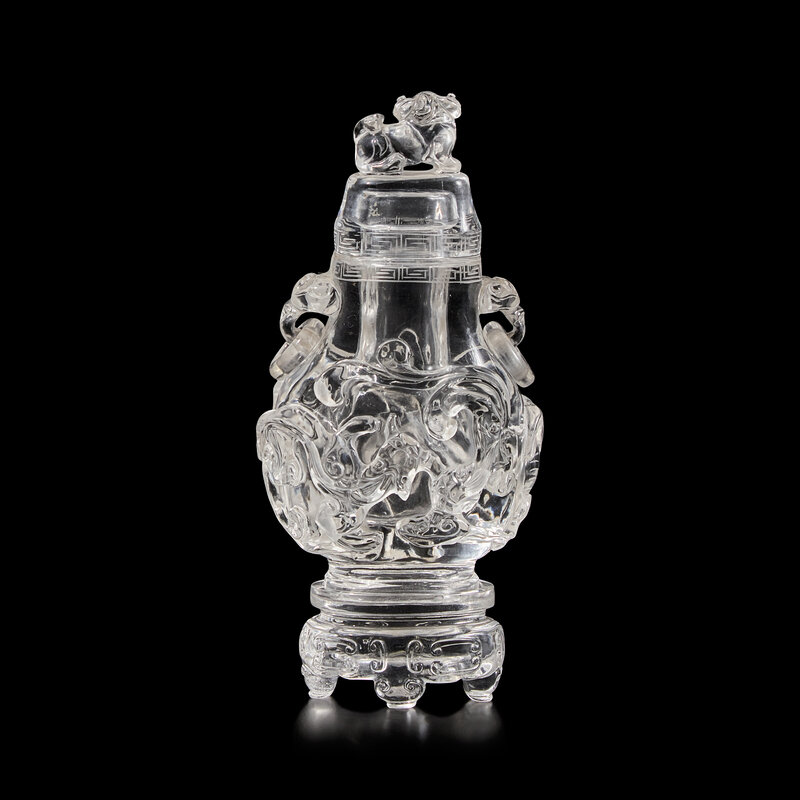 A Chinese Rock Crystal Vase, Cover, and Stand, 19th Century