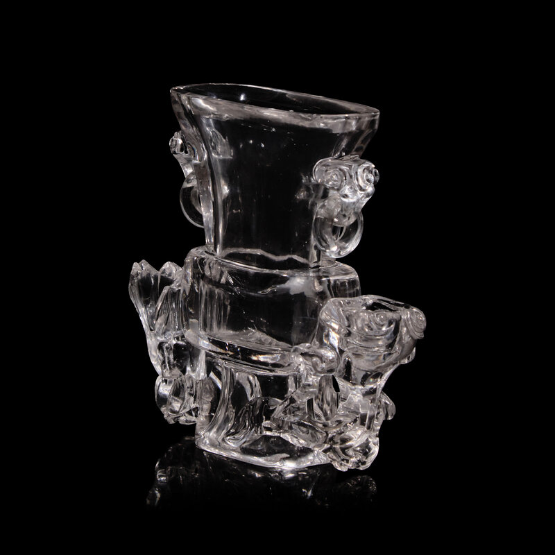 Carved from a very clear stone, the lower section flanked by a lingzhi spray and a magnolia blossom, the upper section is adorned with a pair of ring handles.