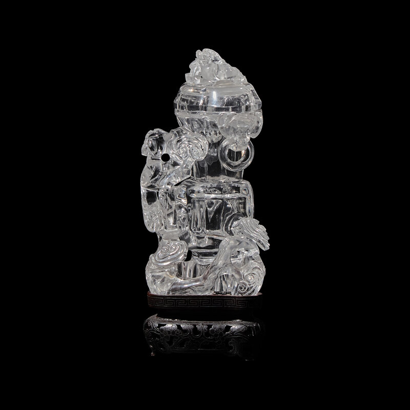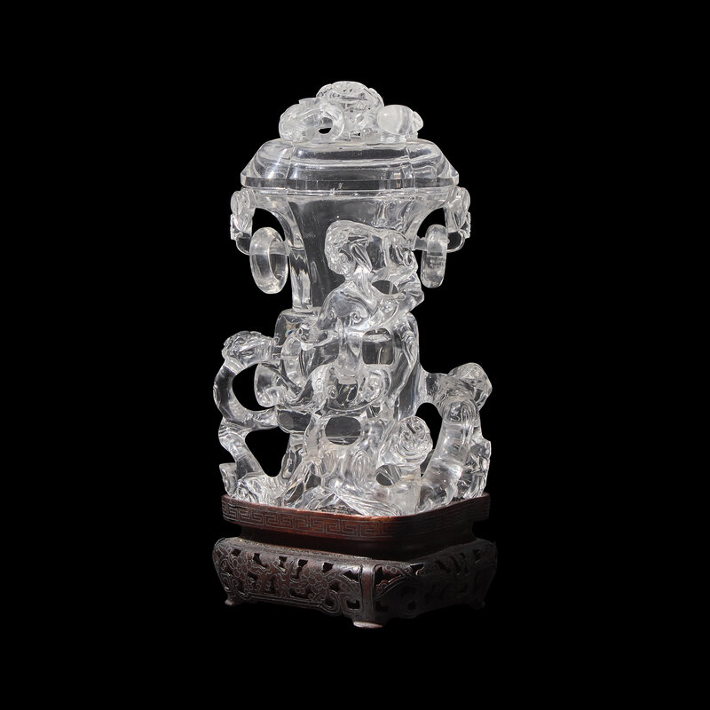 The crystal vase flanked by a crawling chilong and "lingzhi" branches, surmounted by a cover with chilong finial. Silver wire-inlaid stand.