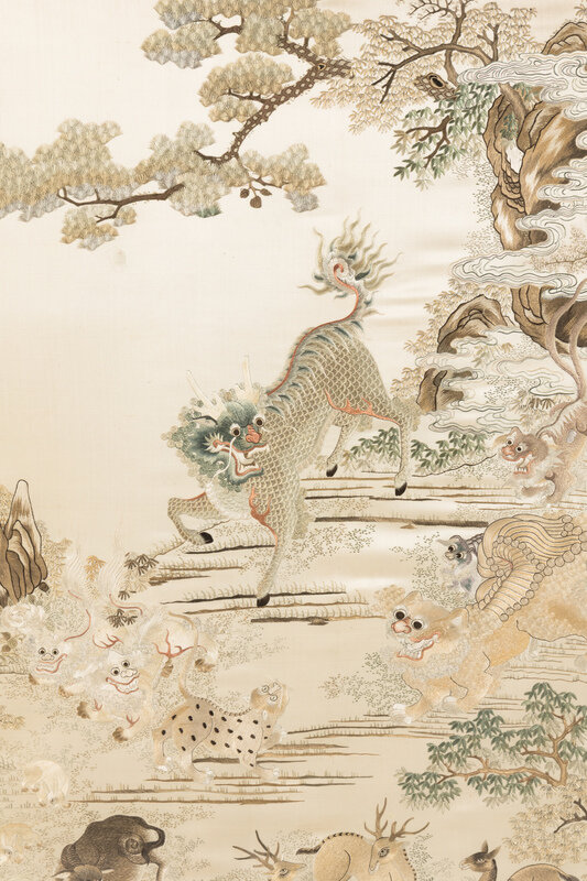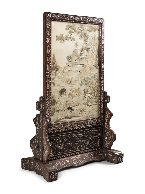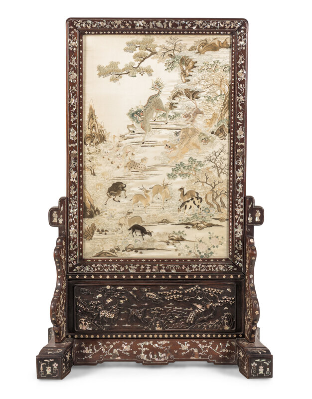 The screen is embroidered with animals, including a qilin, fu lions, a tiger, and numerous deer, all amongst trees, flowering plants, rocks, and cloud clusters. The hardwood frame decorated with mother-of-pearl inlaid figures and foliate scrolls, the stand supported on square-sectioned legs flanked by shaped spandrels, carved to the front in relief with additional animal figures in an outdoor setting, borders with further mother-of-pearl inlaid auspicious objects.
