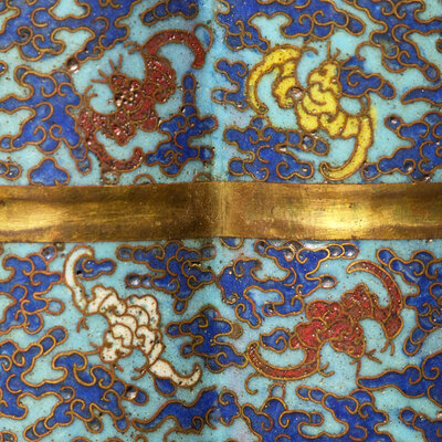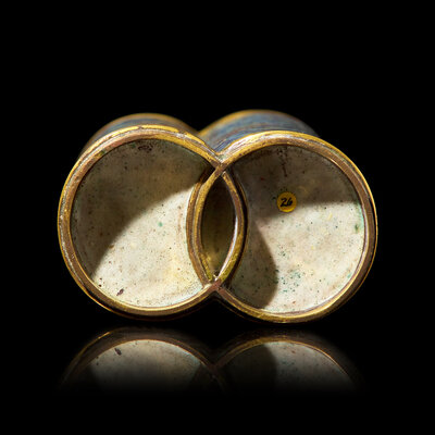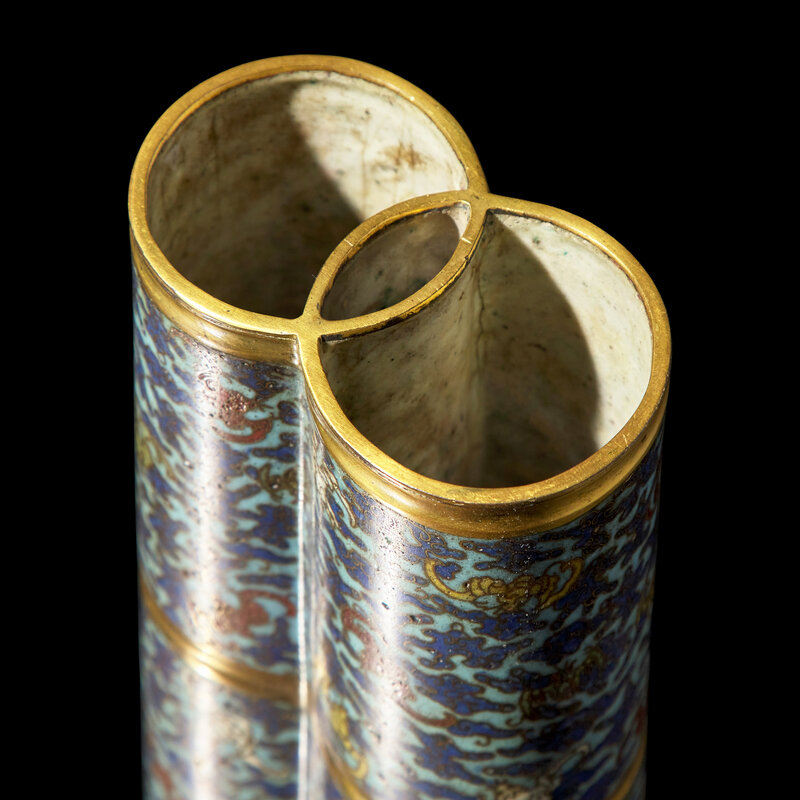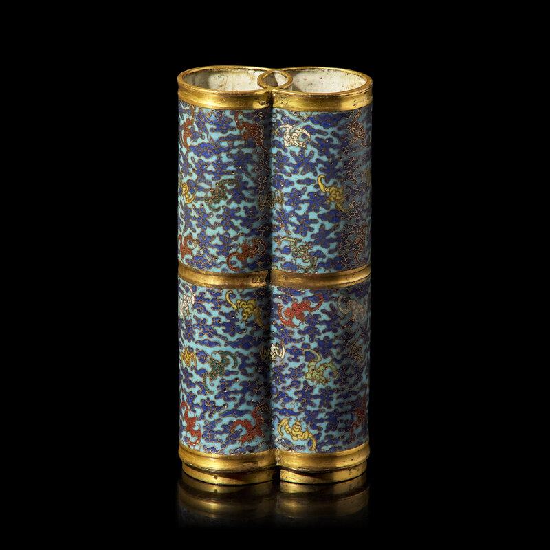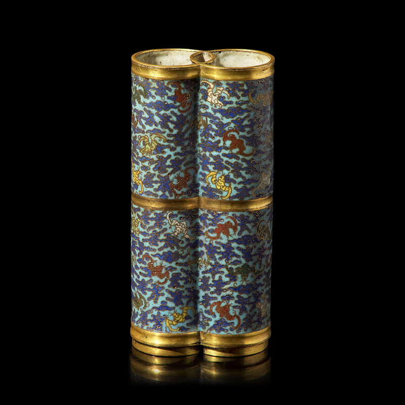The doubled cylindrical vase, comprised of two linked open rings in section, further divided horizontally at mid-section; the turquoise ground with numerous multicolored bats among cobalt blue scrolling clouds; the exposed copper alloy gilded, the interior and underside with greyish-white speckled enamel.