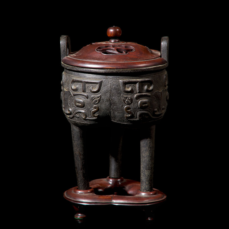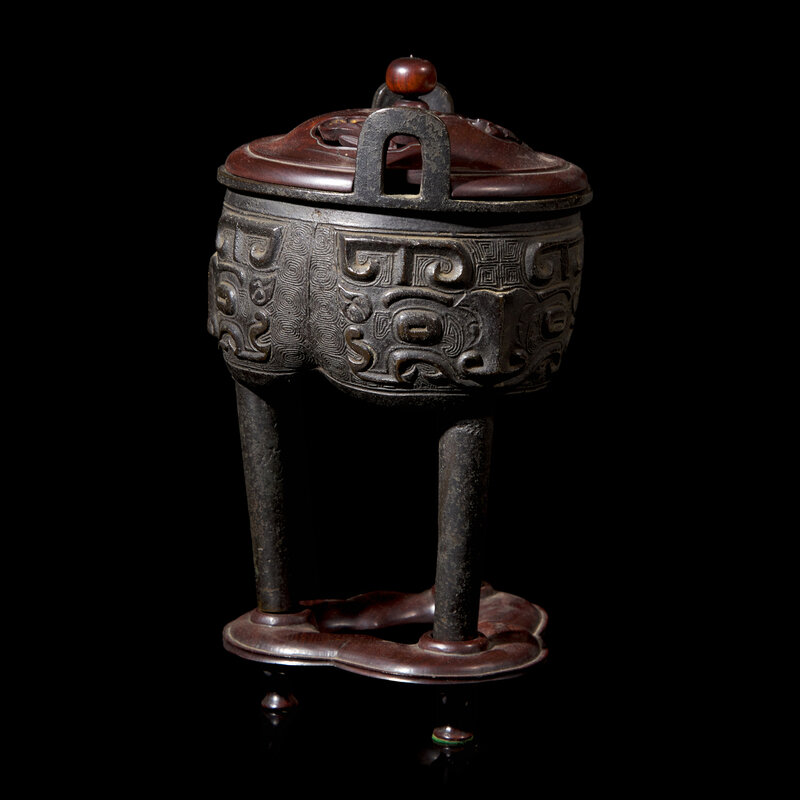 A finely cast bronze censer, skillfully adorned with three stylized taotie masks, pays homage to the iconic artistry of Shang Dynasty ritual bronzes, with later wood stand and cover.