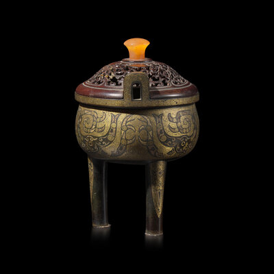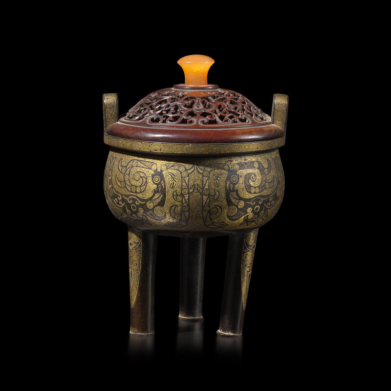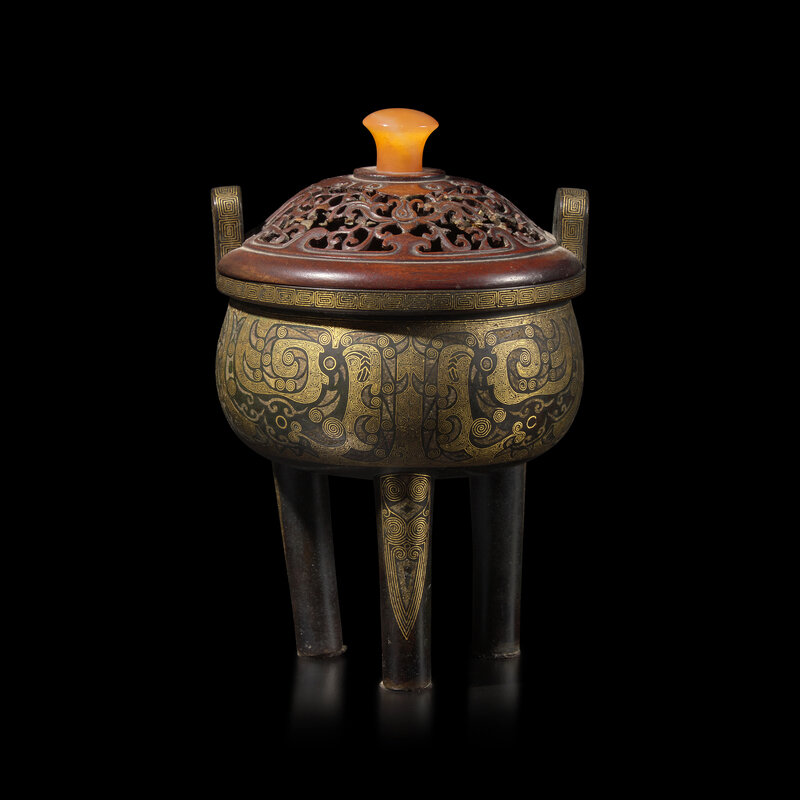 A Small Gold and Silver Wire-Inlaid Tripod Vessel, Ding, With Carved Wood Cover