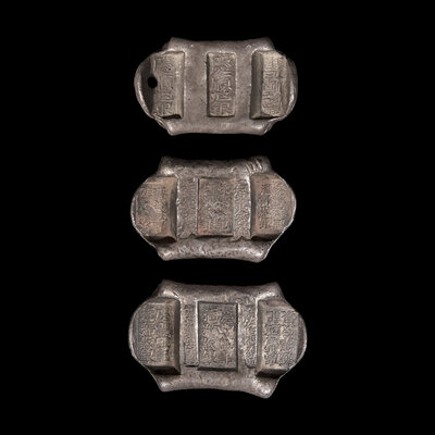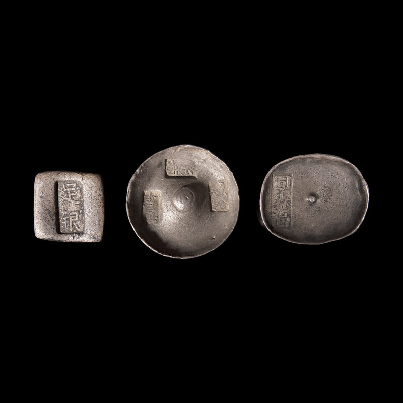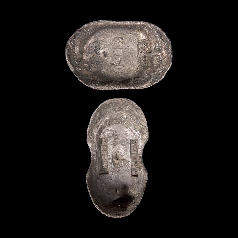 A "bowl" form ingot with three struck mark, weight 174.9 grams.
