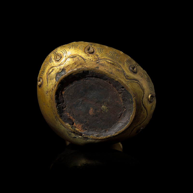 Depicted seated in padmasana, a kapala in his left hand, his right with raised vajra, his robes incised with foliate scrollwork; raised on a lotus throne with large petals and stylized stamens at the base, the underside sealed; traces of pigments to his cap.