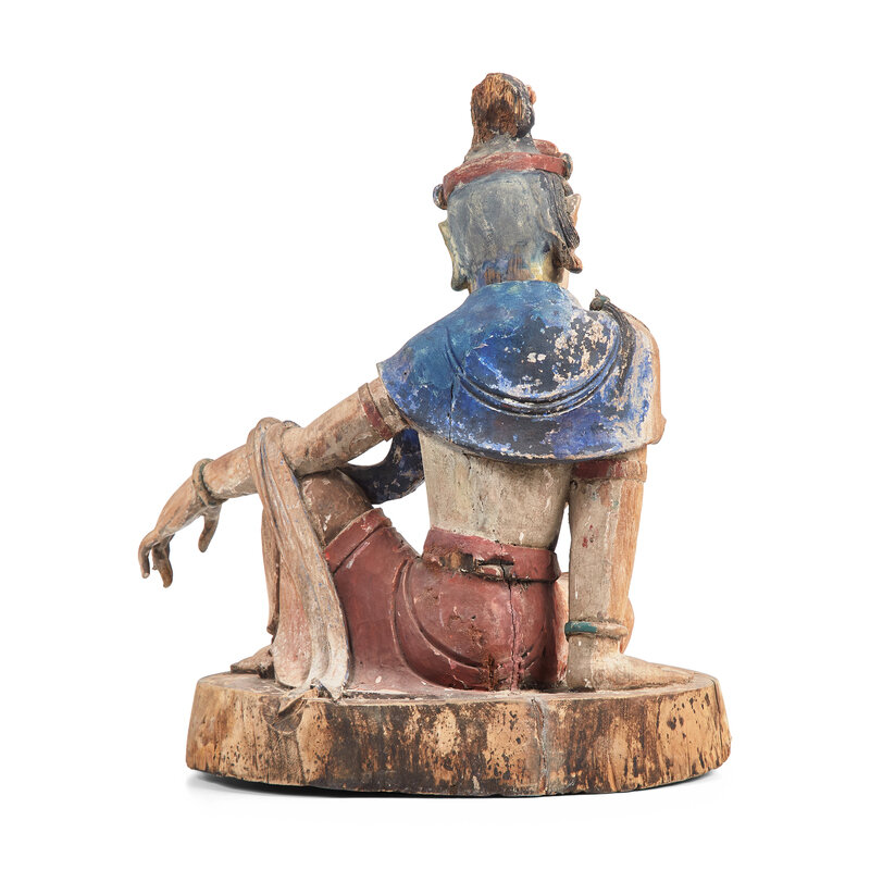 Depicted sitting in rajalilasana atop a flat base, wearing a shawl draped over the shoulders and looped over the arms, a scarf tied around the torso, the dhoti tied above the waist falling in graceful folds around the legs, the face carved with a gentle expression below the gathered hair and scrolling crown, with traces of red, green, and blue pigment to garment, the wood with a cedar-like fragrance.