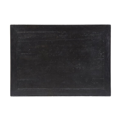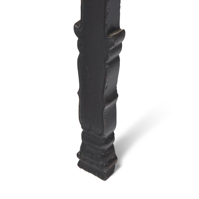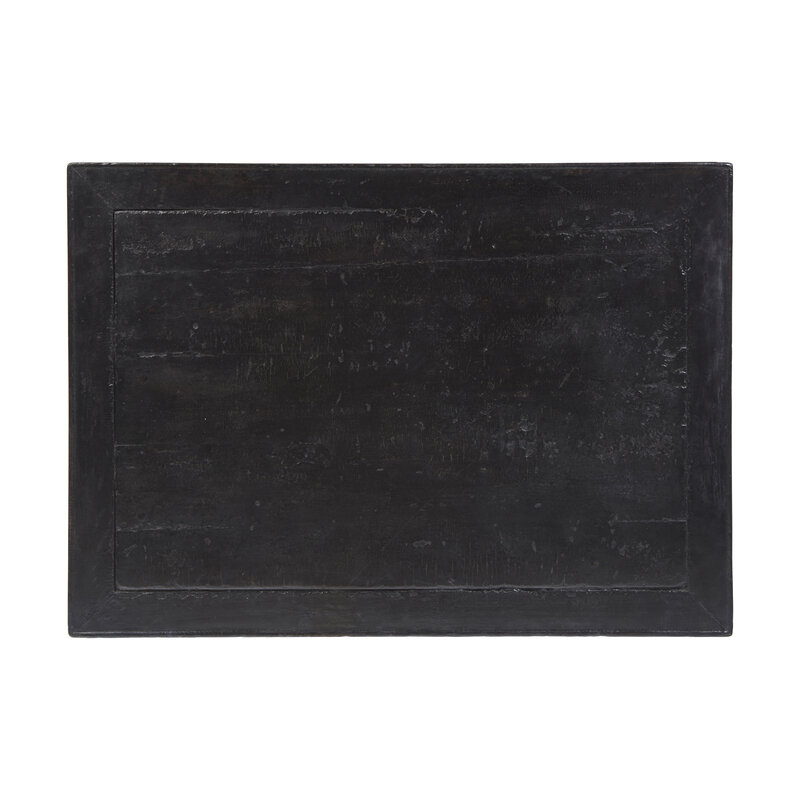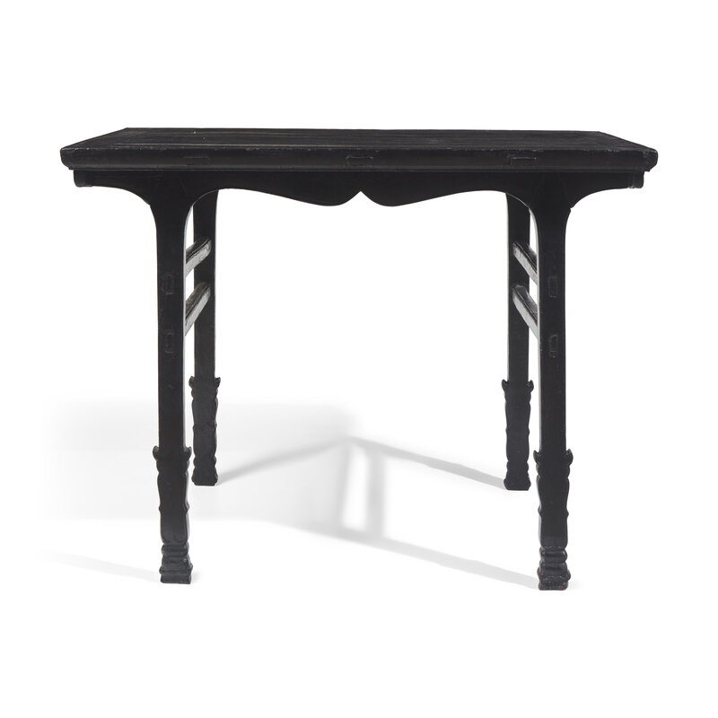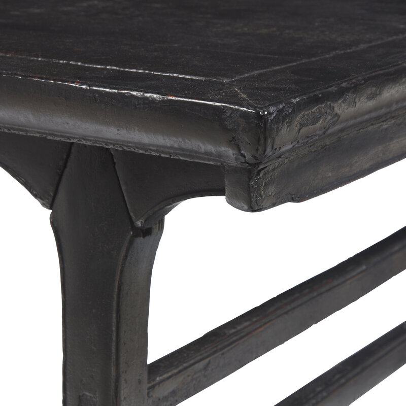 The table consists of a rectangular top with a floating panel set in a wide frame molding downward and inward. Resting on a beaded cusped apron extending to rectangular sectioned legs, terminating in feet each shaped in the form of an imperial sword, further secured by two sets of rectangular stretchers between the legs, covered overall in a black lacquer.