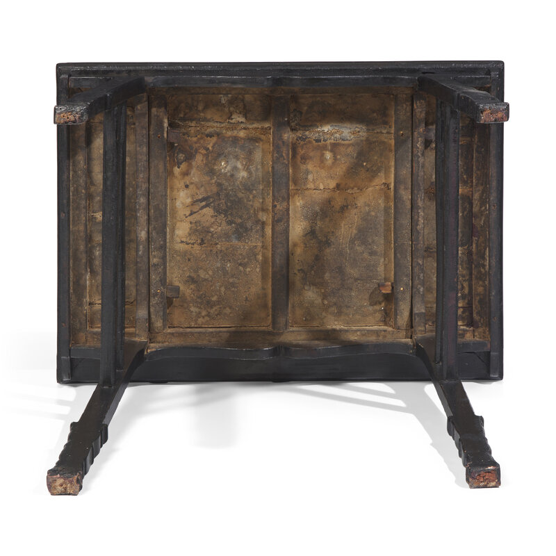 For a similar Ming dynasty Wanli period mother-of-pearl-inlaid black lacquer softwood wine table, see The Anne & Gordon Getty Collection: Volume 4 | Chinese Works of Art, English and European Furniture and Decorative Arts, Day Sale, Christie's New York, 23 Oct 2022, sale 21607 lot 612.