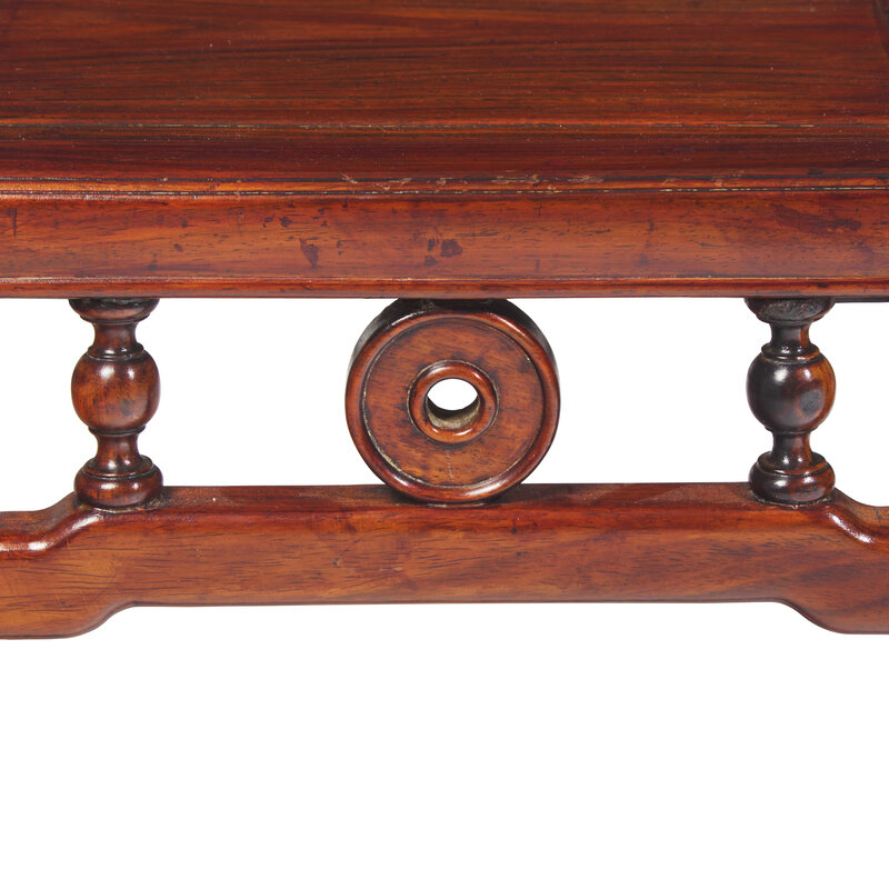 Each mitered seat frame enclosing a single raised panel; each apron fitted with a pair of baluster spindles, centering a central carved and pierced rondel with galleried lip; lower stretchers connect the legs that terminate in horse hoof feet.