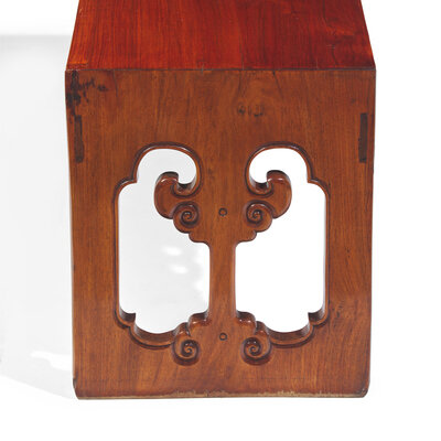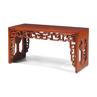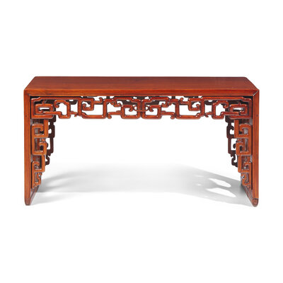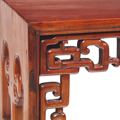 The single-panel top with beaded edge above reticulated aprons and spandrels carved as scrolling chilong, the whole raised on panel legs carved with two central ruyi and terminating in scroll-form feet.