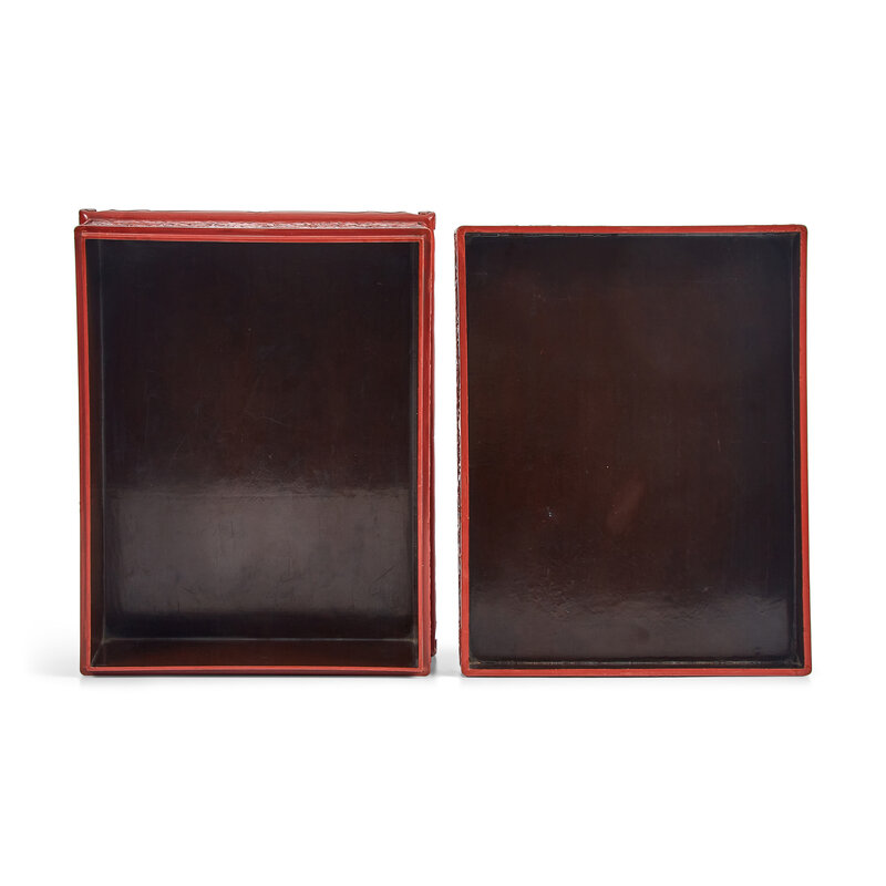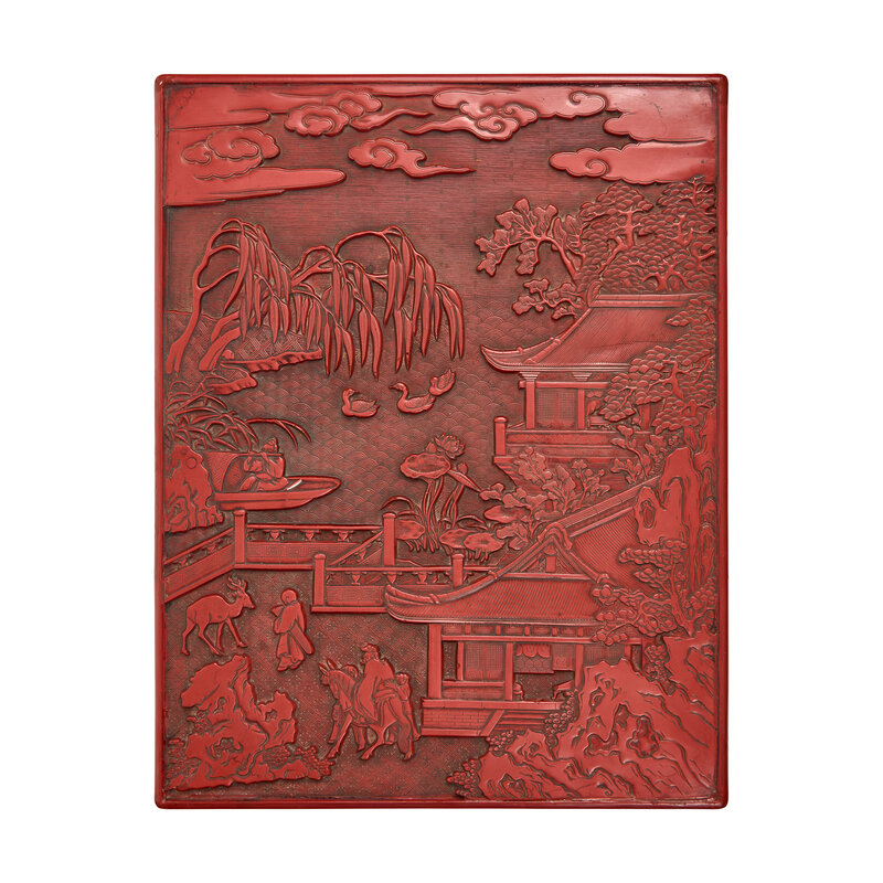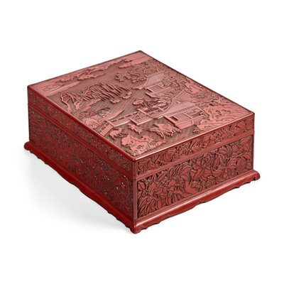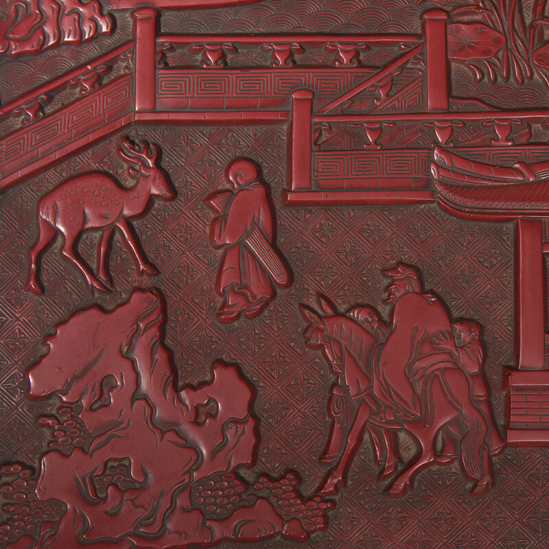 The box of large rectangular form, the flat cover deeply and crisply carved with figures in a fenced terrace in front of a pavilion amongst tall trees and jagged rockwork, a scholar riding assisted by two attendants, accompanied by a boy carrying a qin, standing next to a deer; a lotus pond in the distance, with three ducks and a flautist seated in a sampan beneath a willow tree, all below cloud scrolls and against a diaper ground, the sides carved with luxuriant flowering peonies; the interior of the box and of the cover lacquered in dark brown; with original Japanese wood box and cover.