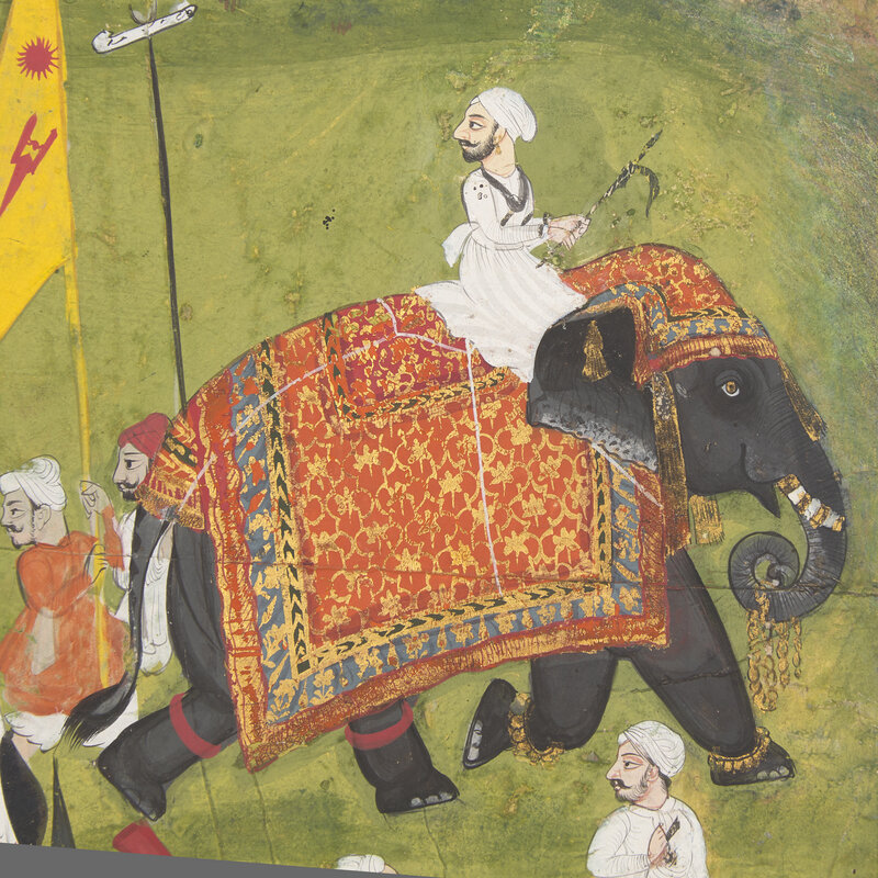 Opaque pigments with gold on paper, depicting a royal procession prominently featuring two elaborately attired equestrian princes accompanied by an elephant and attendants.
