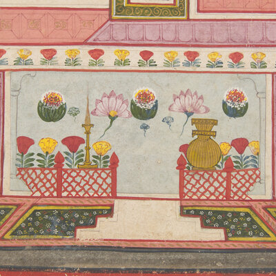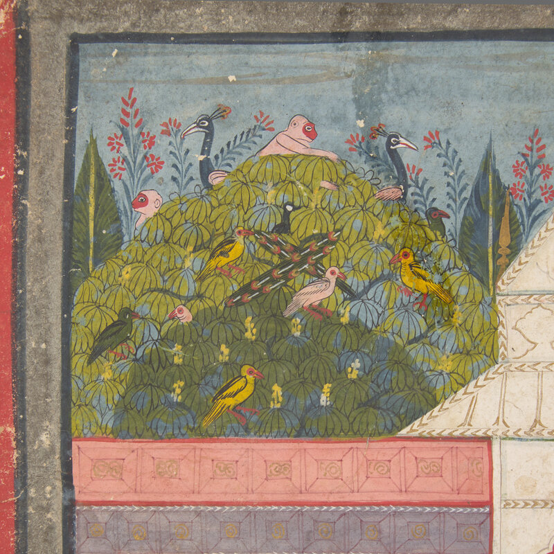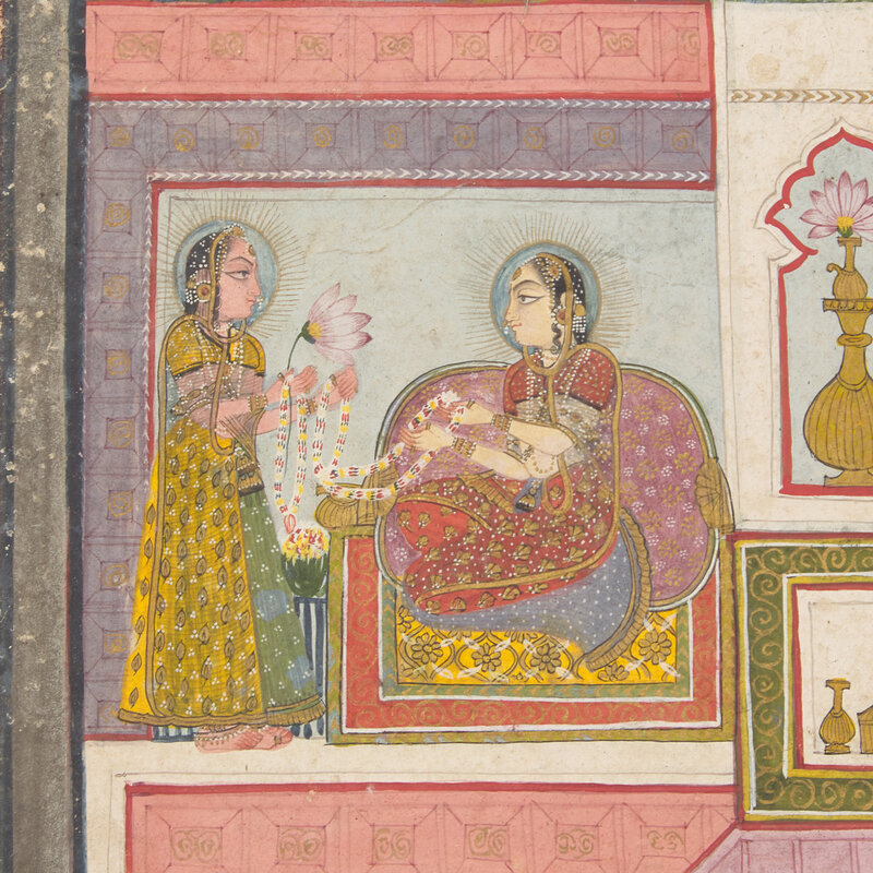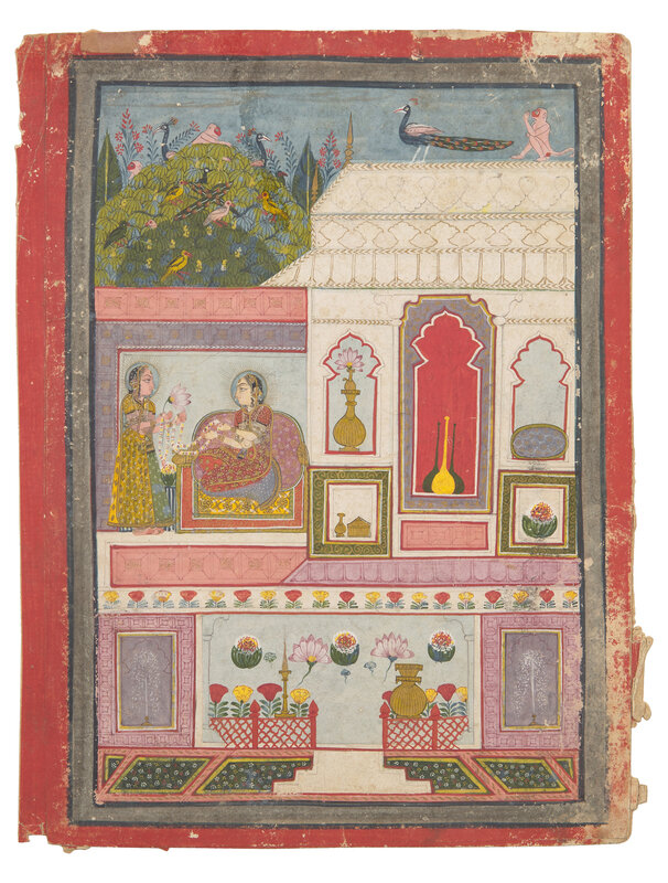 A ragamala (garland of ragas) is a unique pairing of paintings and poems that capture the essence of the classical Indian musical system. Each raga and ragini ('wife' of a raga) is associated with a time of day and season to evoke a particular mood. This is probably Malasri Ragini, which, like Varari (#21), is a morning raga for the rainy season. Here the heroine leans forward to take the garlands from her attendant's hands. The large golden water pot is no longer in a niche on the wall, but below in the garden, set ready for her morning bath which will prepare her for the arrival of her lover. The flat bold colors, schematic architecture and foliage show that this painting came from a workshop in central India. It's size and the unusual silver stripe in the border indicate that it, along with #21, was once part of the same ragamala as two pages in the Philadelphia Museum of Art (1968-12-3 and 1969-262-2).