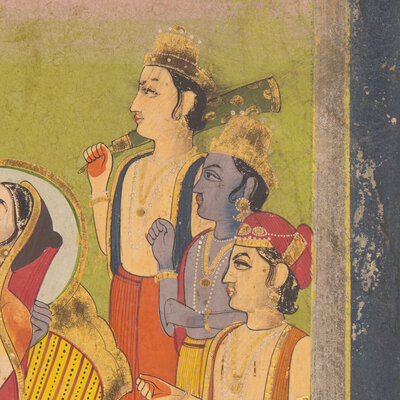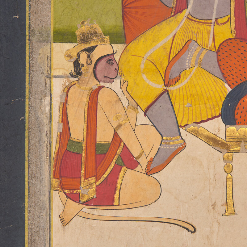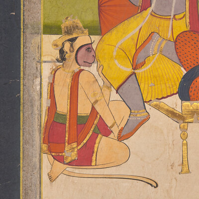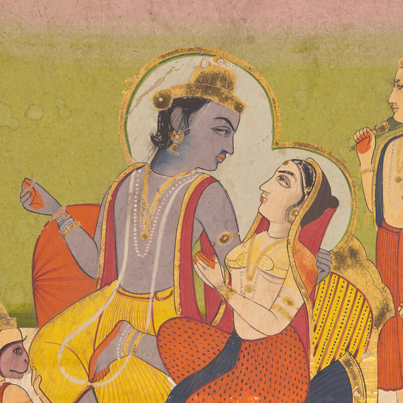 Gouache and gold on paper, depicting Rama and Sita with Hanuman with their attendants.