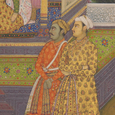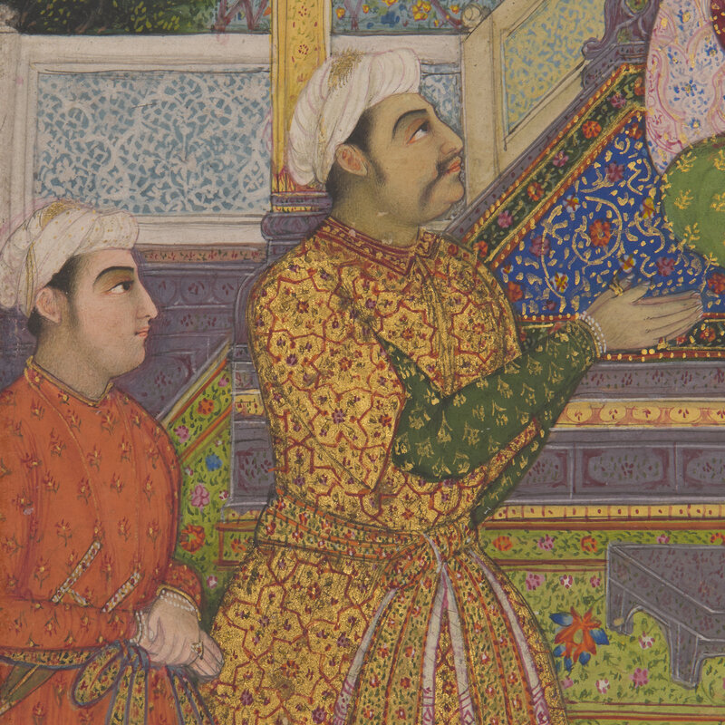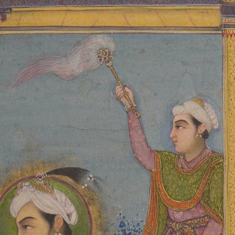 Opaque watercolor on paper, framed and glazed; seated on a raised dais and attended by high-ranking ministers and servants.