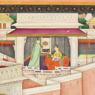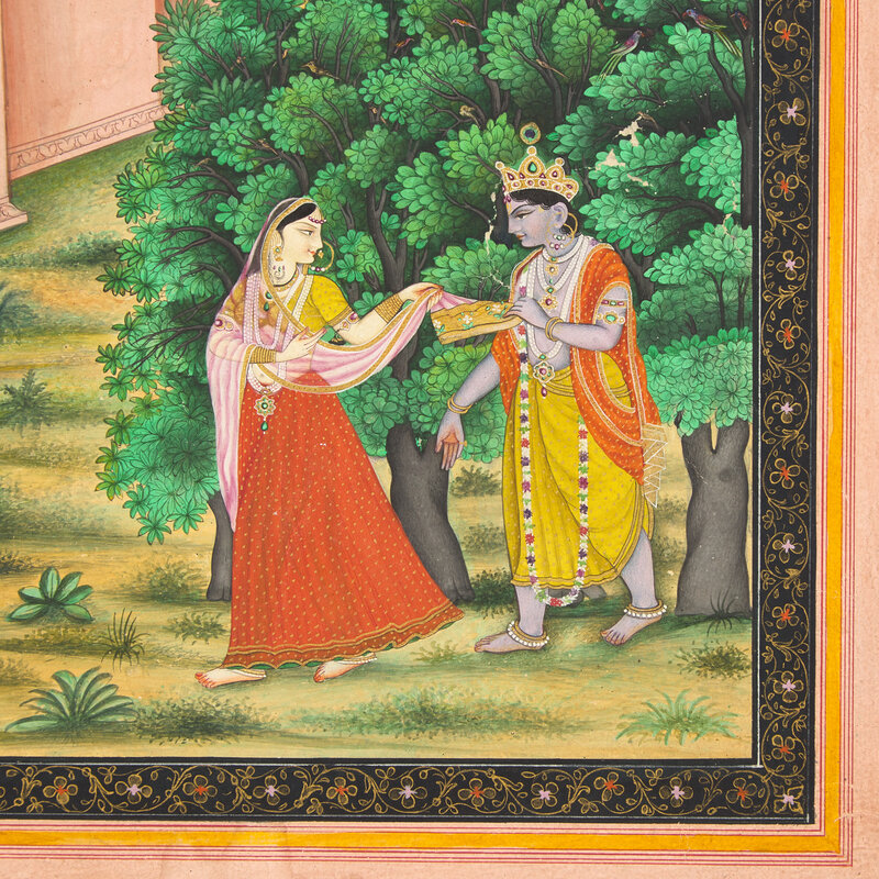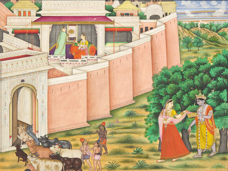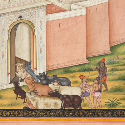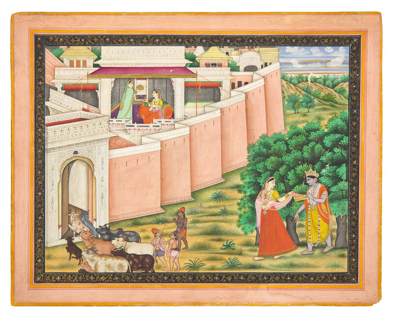 Opaque pigments and gold on paper, depicting Krishna greets his beloved Radha outside towering palace walls as the cows and cowherds enter through a great arched gateway at the close of day, the “hour of cowdust”, two court ladies in a pavilion in the distance, the inner border with colored and gilt highlighted floral scrolls, the outer margins pink.