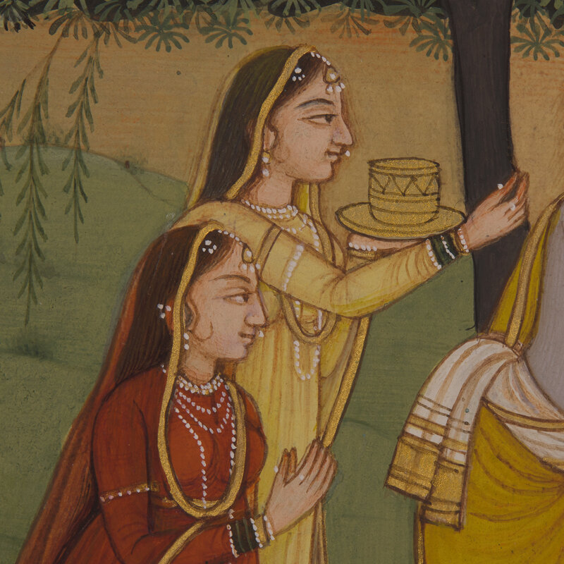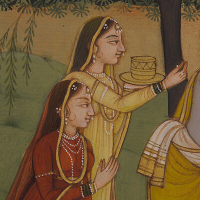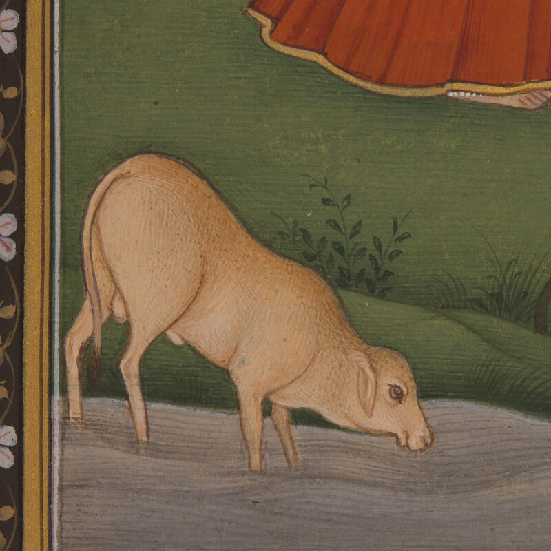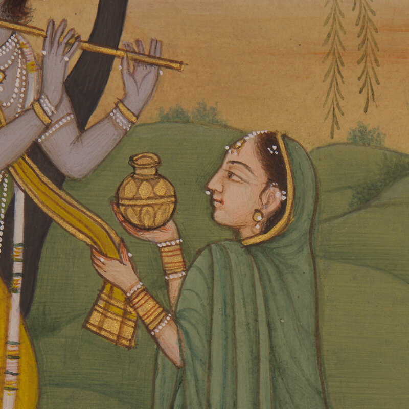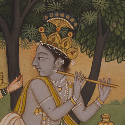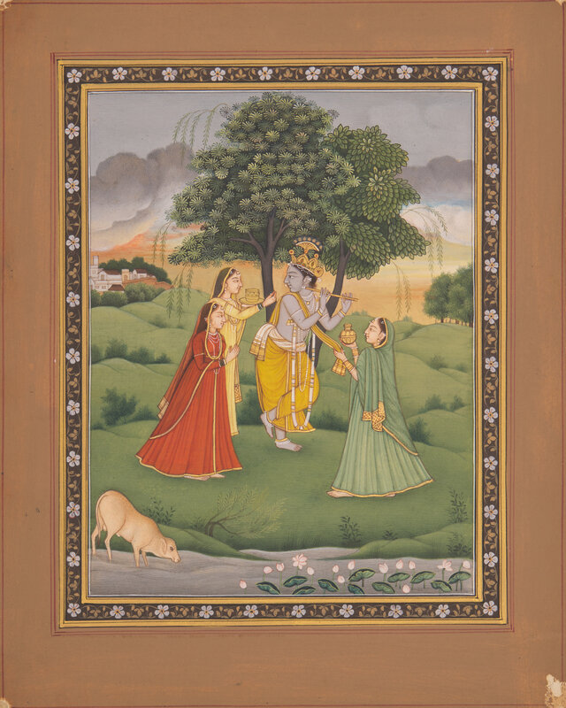 Gouache and gold on paper, finely painted to depict Krishna charming a group of gopis with his flute under a tree in a rolling green landscape, the inner border with white colored and gilt highlighted floral scrolls, the outer margin brown.