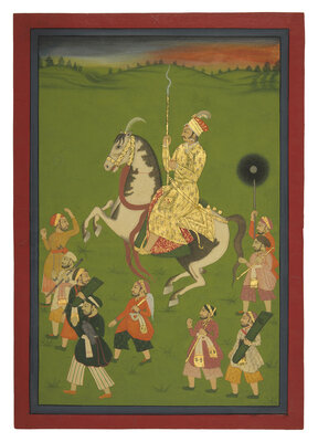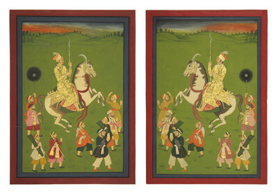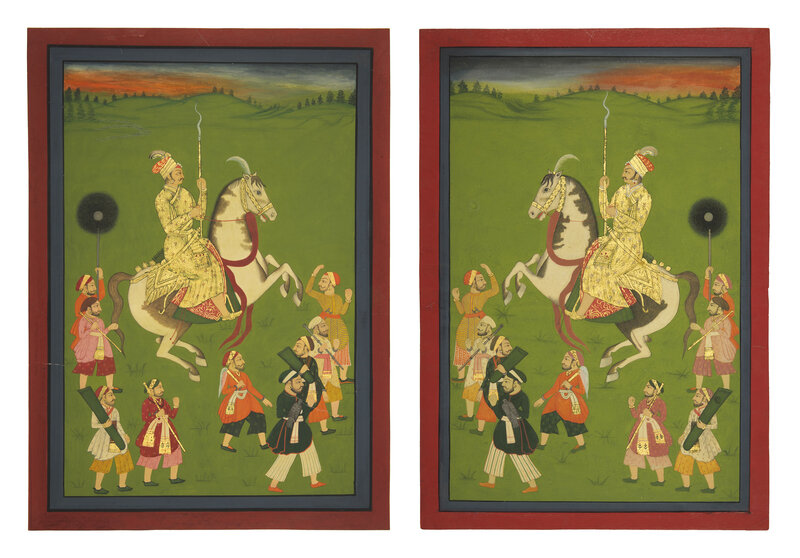 A Fine Large Pair of Equestrian Processional Paintings, North India, In the Manner of Mewar, Udaipur, 20th Century