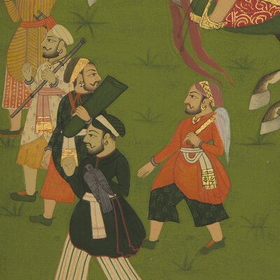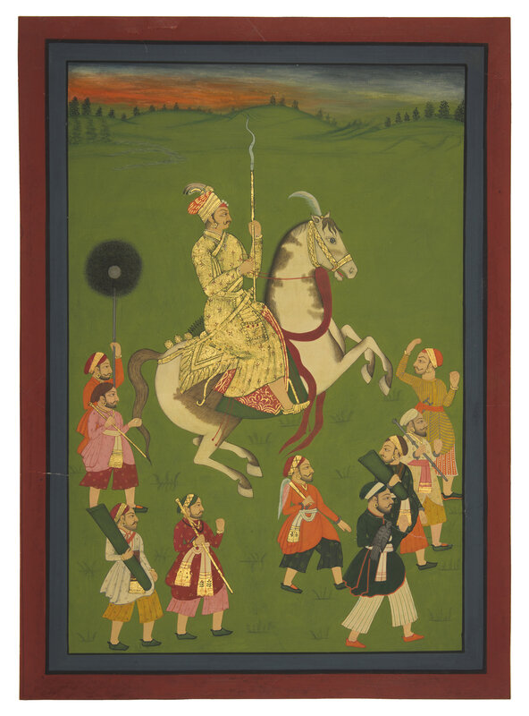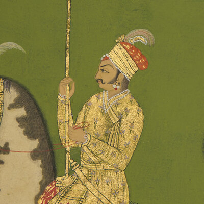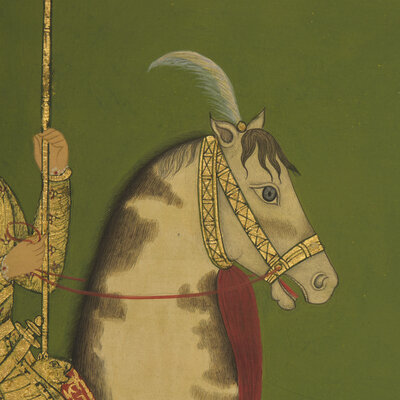 Ink, color and gold on paper; each depicts an elegantly clad equestrian prince seated atop a rearing horse while holding a long vertical staff, accompanied by colorful attendants on a green field.