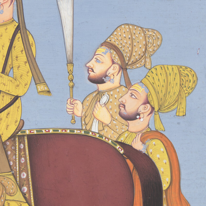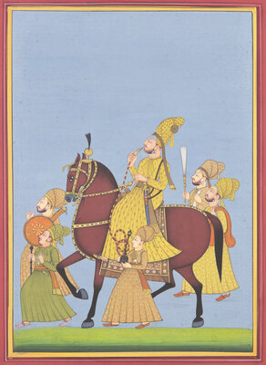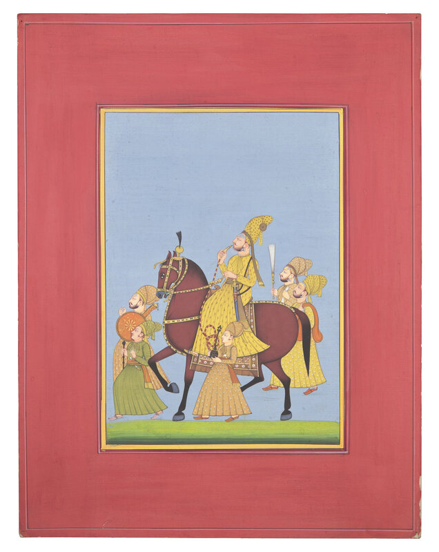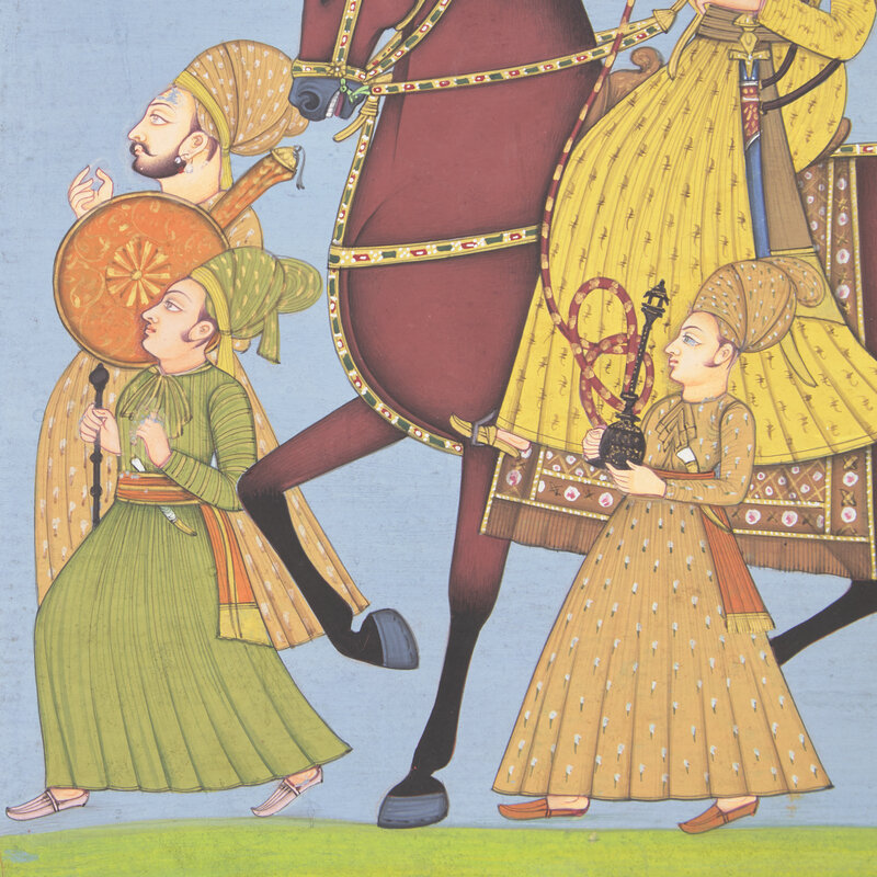 A Painting of a Marwari Equestrian Nobleman Smoking a Hookah Flanked by Five Pleated-Skirt Attendants, Jodhpur School, 20th Century