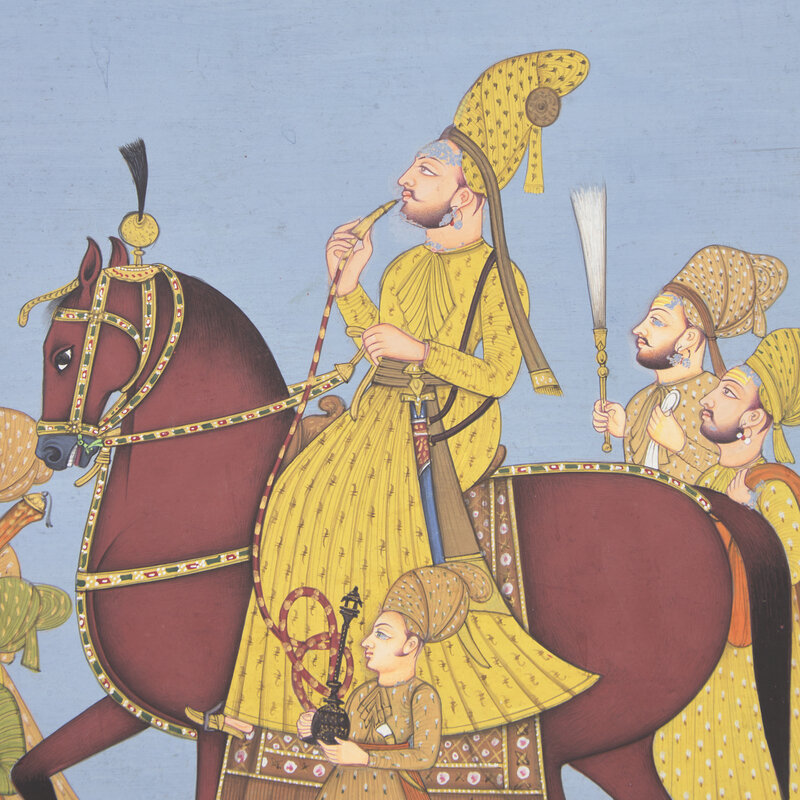 Opaque watercolor on paper, depicting a prince smoking a hookah, riding on horseback with his attendants, light blue background behind.