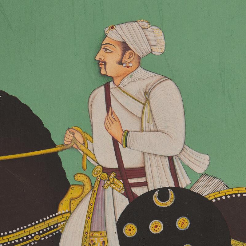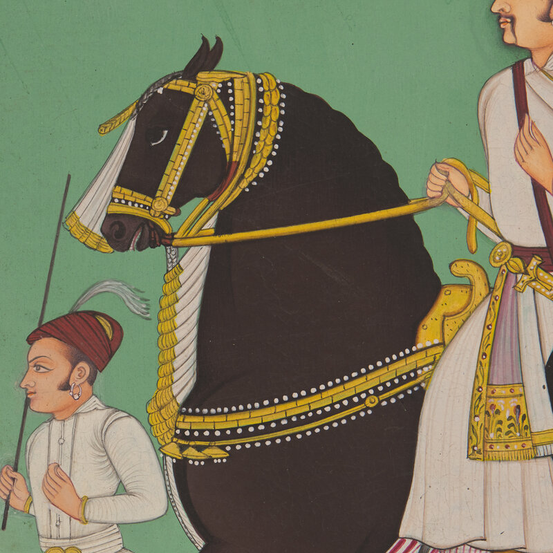 Opaque pigments and gold on paper, depicting the prince riding on a prancing horse with attendants, blue and green background behind.