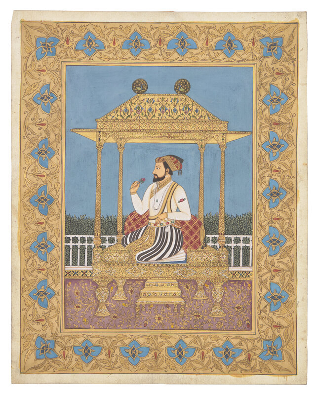 Opaque pigments and gold on paper, depicting the emperor seated on the throne, his right hand raised holding a floral stem, his left hand lowered touching his dagger, blue background behind, margins with black-outlined and blue colored floral scrolls.
