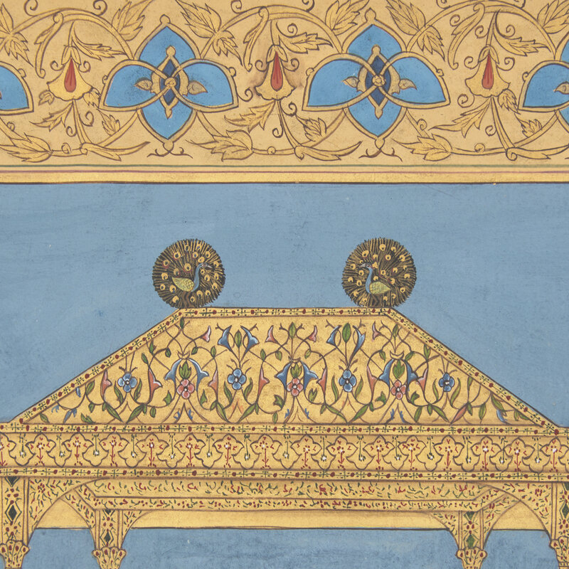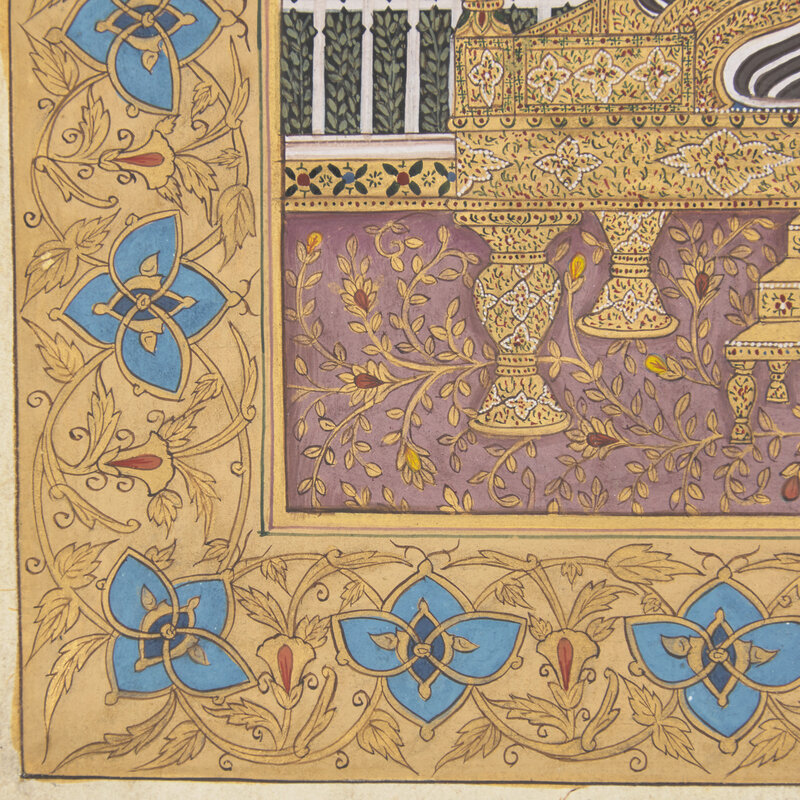 A rendering inspired by a very similar early 17th century Mughal painting, dated 1635, celebrating Shah Jahan’s inauguration of the magnificent Peacock Throne.
