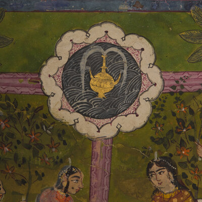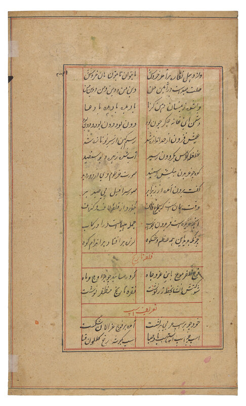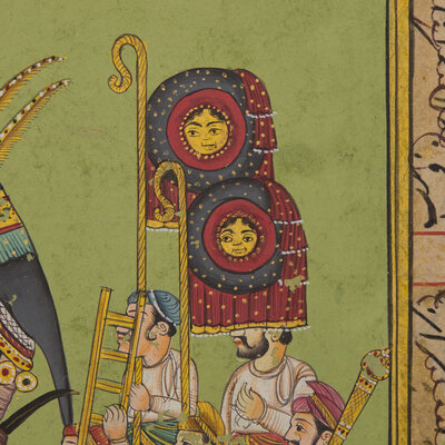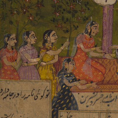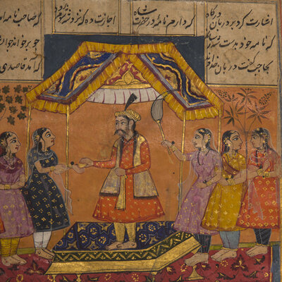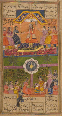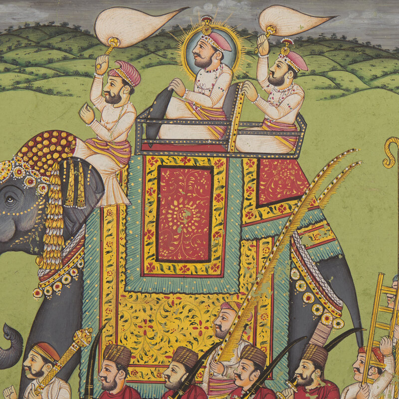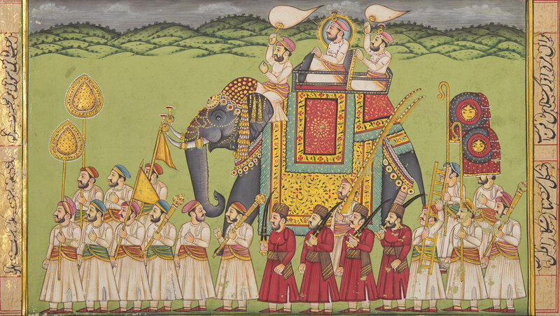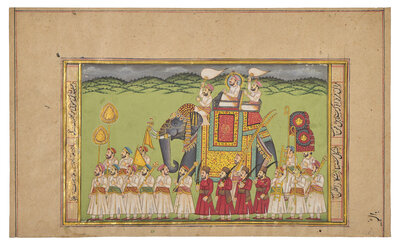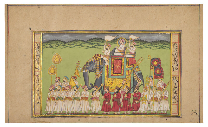 Both paintings with opaque pigments and gold on paper; the first a painting of majestic Maharaja processional scene, borders and the reverse with inscriptions, North India ,in the manner of Jaipur/Kota, signed; the second depicting a ruler beneath a canopy attended by the women of his zenana, with additional figures in a garden below, Persian couplets in nastaʿlīq surround the scene and continue on a related text-only folio from the same manuscript, India, Provincial Mughal.