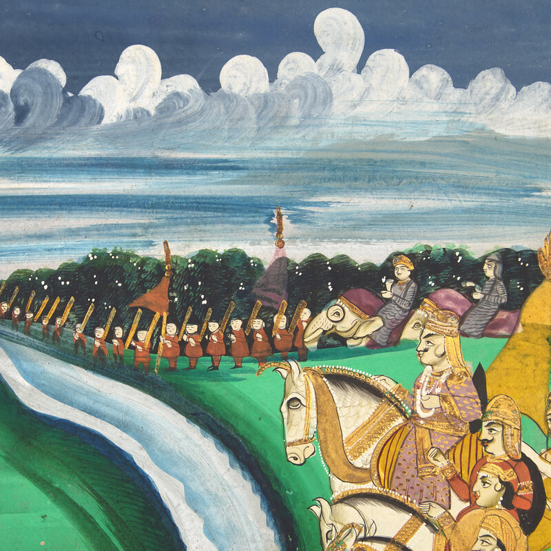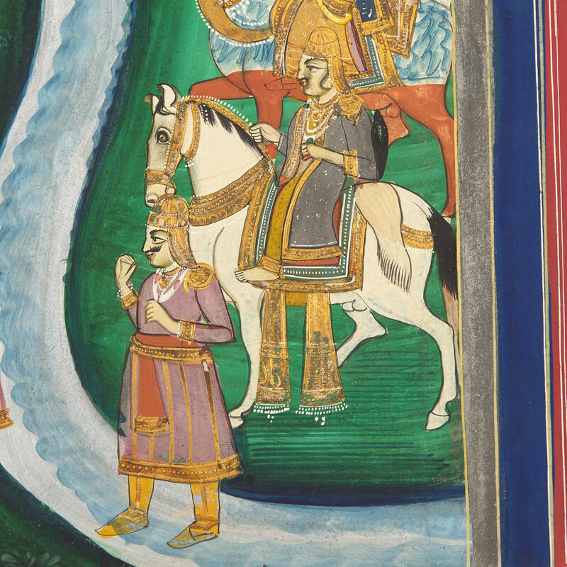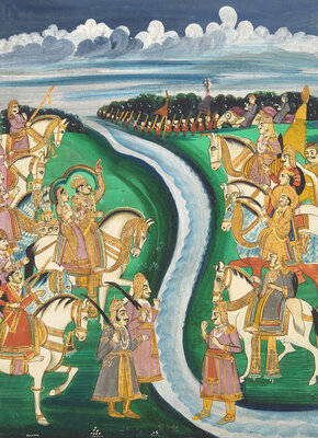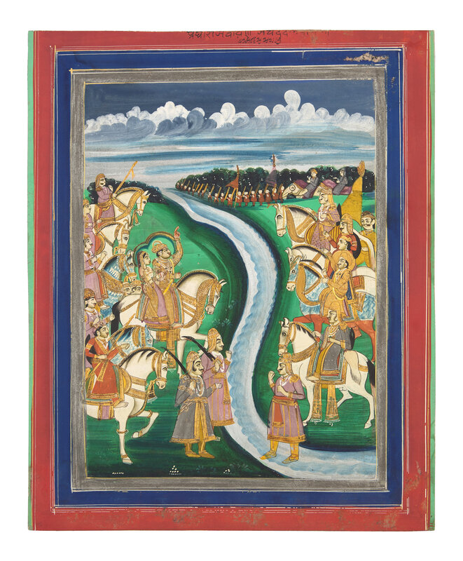 A Painting of Flanking Equestrian Figures on Either Side of a Meandering River, Rajasthan, Bazaar Workshop, Late 19th/20th Century