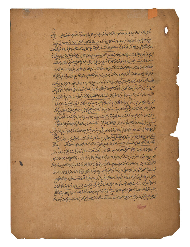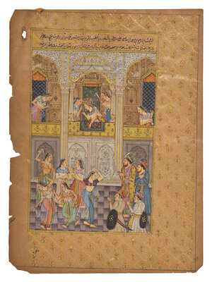 Opaque pigments and gold on paper, mounted onto the illuminated manuscript leaf, the reverse with black inscriptions, margins with black-outlined floral sprays.