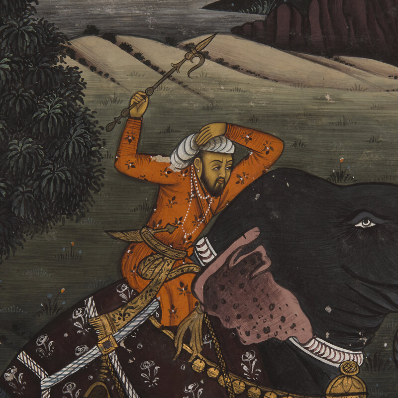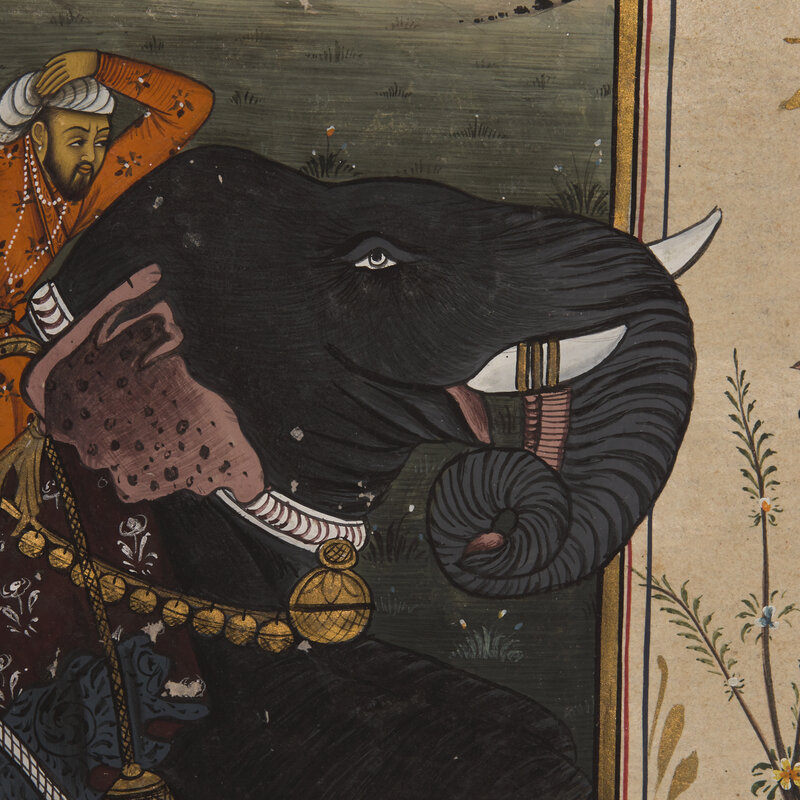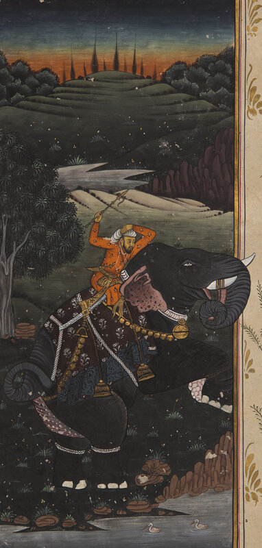 A Folio Painting of a Striding Elephant with Mahout at Sunset, North India, 20th Century