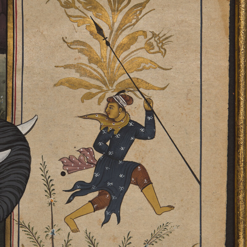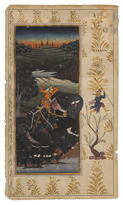 Recto with opaque pigments and gold on paper, the painting mounted onto the illuminated manuscript leaf, the reverse with black inscriptions within a red frame, margins with black-outlined gold figures and gold highlighted floral sprays.