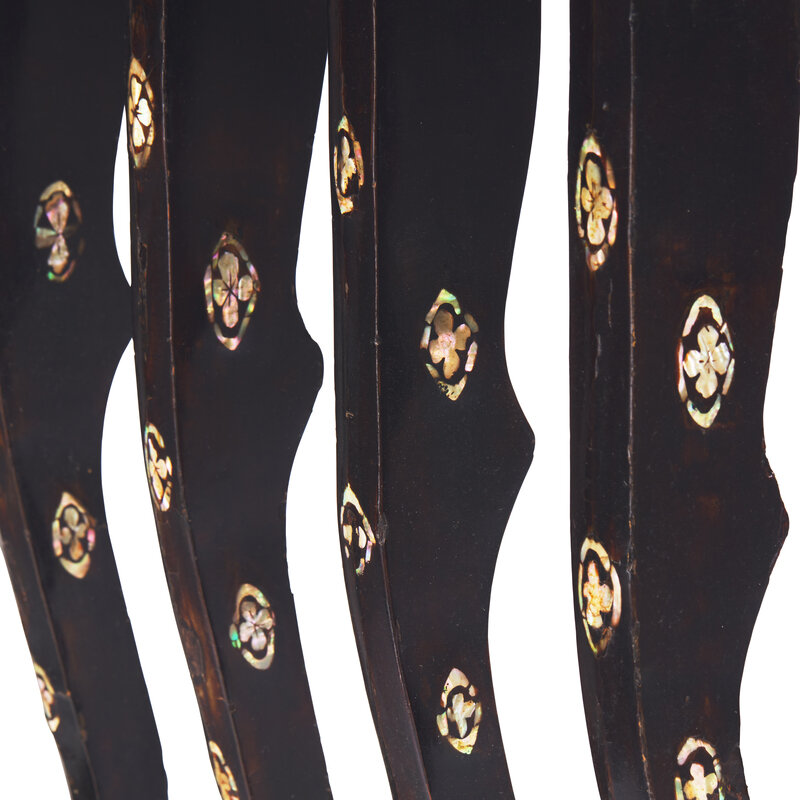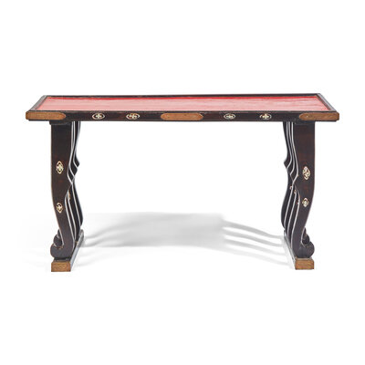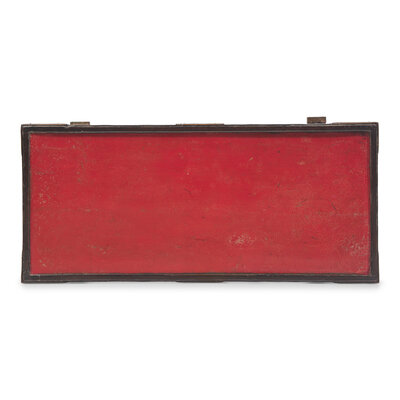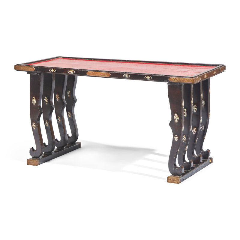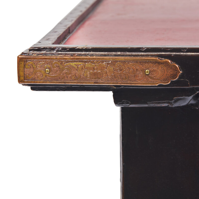 The single top panel set within a rectangular frame with beaded borders, above two groups of cabriole legs with half scroll feet connected by a stretcher, the top panel lacquered red, the top frame and legs lacquered black, decorated with metal mounts and mother-of-inlaid flower heads.