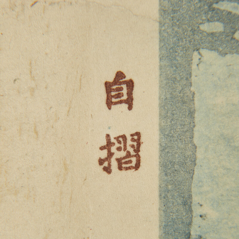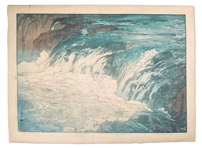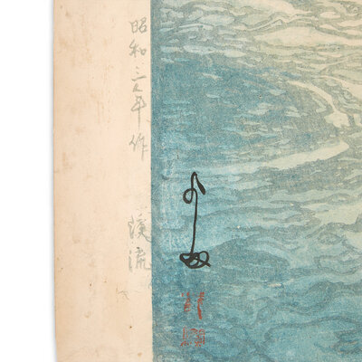 Abe #104; Rapids depicts the upper reaches of the Tone River. It is one of Yoshida's largest prints and was said to be a favorite of the artist. For another example, see the print acquired in 1938 by the Museum of Fine Arts, Boston, #38.725.