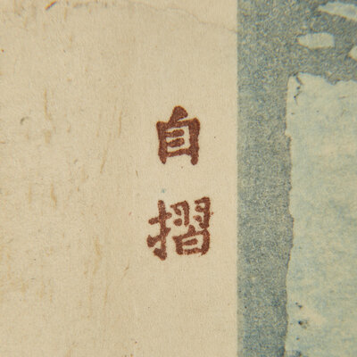 Signed in pencil lower right, titled lower left, signature and two seals in the image lower left, Jizuri stamps and block-printed date and title along left edge.
