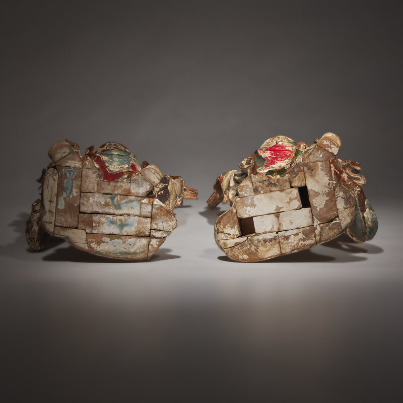A pair of wood deity figures, each featuring vividly carved facial details accentuated by inset glass eyes. Their flowing, windswept robes are similarly adorned with elaborate and fanciful carved decoration; retaining extensive areas of polychromed surface.