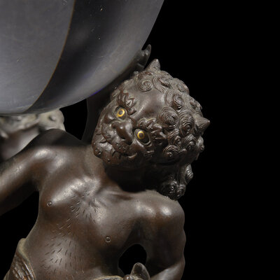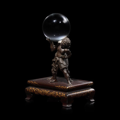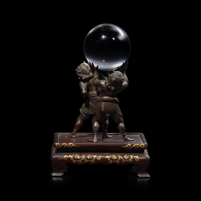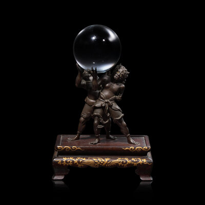 This finely cast bronze pair of oni with gilt eyes is mounted on a wood base, the two figures upholding a crystal (glass) ball above them. The stand is further embellished with detailed gold-lacquered scroll motifs. The maker’s mark is discreetly inset to back of one of the oni’s loincloth.
