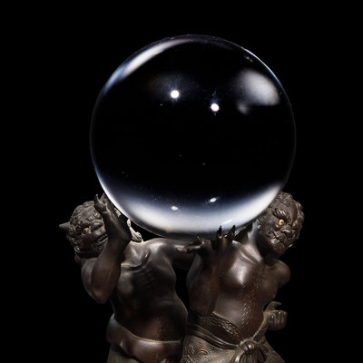 Height of bronze with stand (without sphere) 7 1/2 in., 19.1 cm; Diameter of the crystal ball 3in., 7.7cm