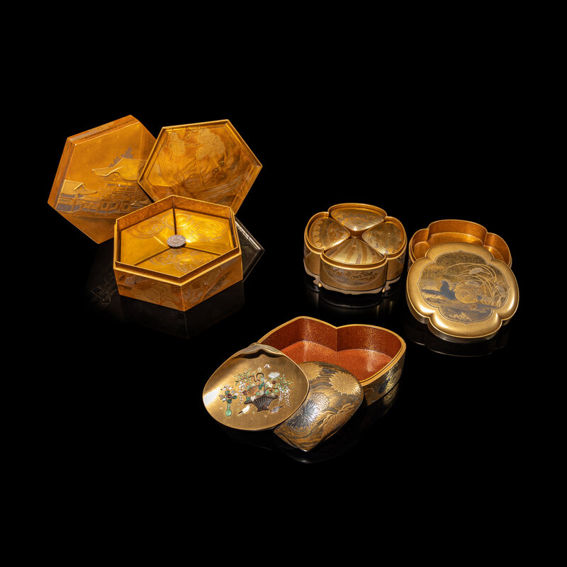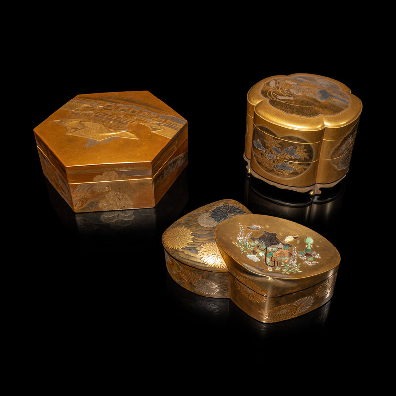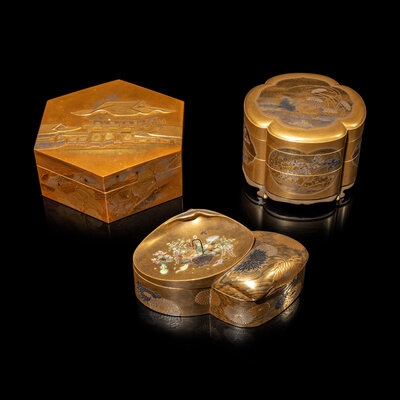 The first of hexagonal form, the exterior finely decorated with a continuous garden scene with pavilions; the interior fitted with a single hexagonal tray painted with a mountainous landscape, the interior and underside finished in nashiji. The second of quatrefoil tiered form, the cover centered with a quatrefoil panel enclosing two quails beneath reeds, the four sides each with shaped reserves enclosing flowering plants; the interior fitted with four small clam-shaped covered boxes and two quatrefoil trays, the interior and underside finished in nashiji. The third was modeled as a pair of shells, the left half of the cover inlaid with hardstones depicting birds and vessels filled with flowers, the right half decorated in gold, silver, and black lacquer with blossoming chrysanthemums, the motif repeated along the sides; the interior decorated with gilt floral sprigs.