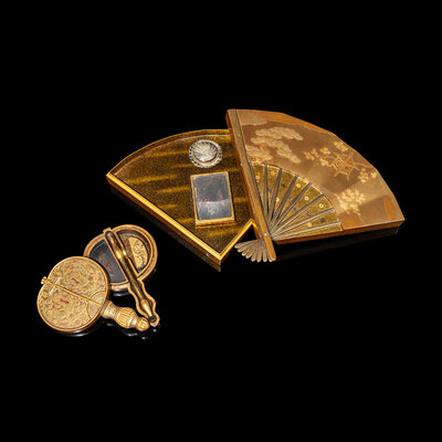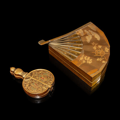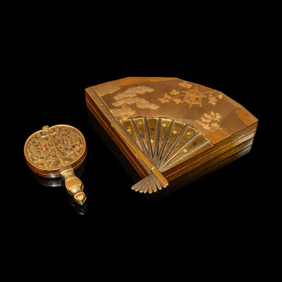 The larger example in the form of a folding fan, the cover lacquered in gold and laque burgauté depicting an outdoor scene with a pavilion underneath pine and Japanese maple trees, the interior and the underside nashiji, together with an inkstone and a silver water dropper; the smaller example in the shape of a round fan, the cover decorated in gold, red and green showing a pair of ho-oh birds standing opposed to each other enclosed by foliate sprigs, together with a brush and an ink cake.