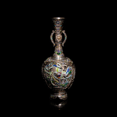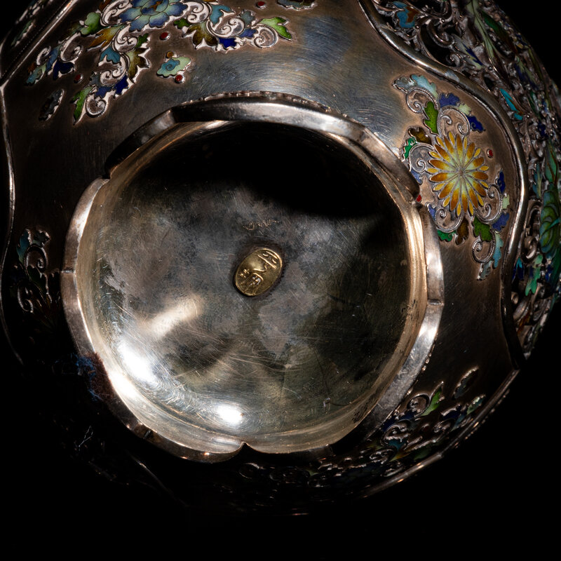 The ovoid body rising to an elongated neck flanked by a pair of curved handles, topped with a flared mouth, the main panel decorated with pieced ho-oh birds amongst foliate scrolls and enameled with red, purple, blue and green champlevé, divided by floral blossoms in similar enamels repeated on the neck, the underside bearing a two-character marker's mark on a gilt highlighted panel.