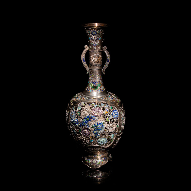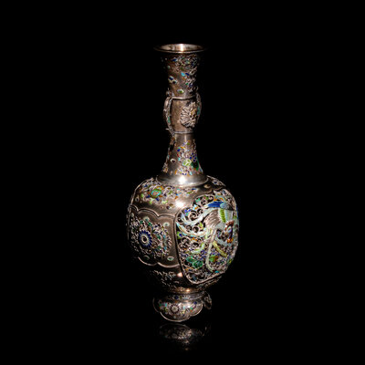 A Japanese Pierced Silver and Enamel Vase, Early 20th Century