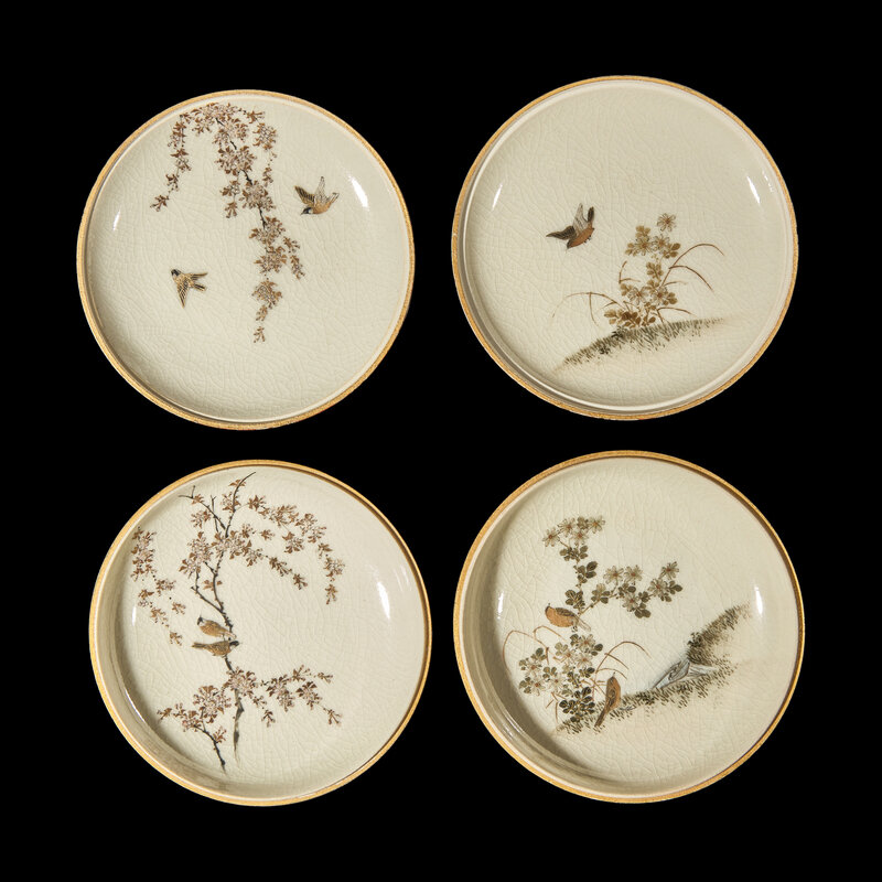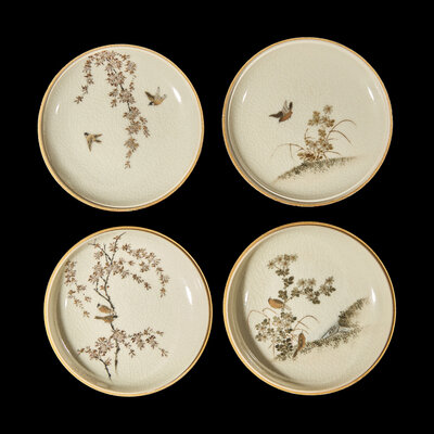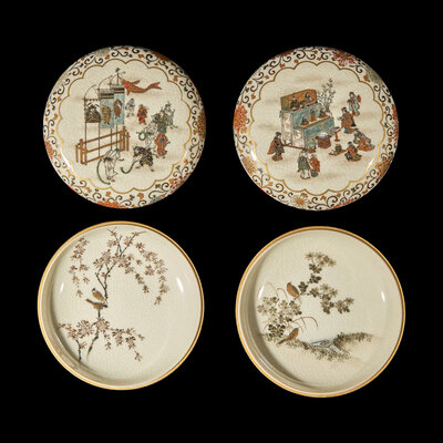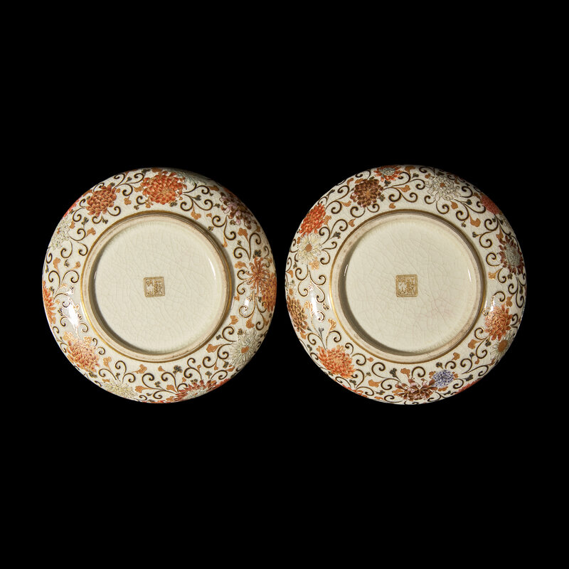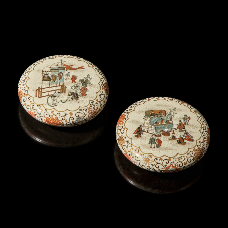 Of flattened circular form, one decorated with boys at various pursuits before a Tango no Sekku (Boy's Day) display, the interior with birds and flowering branches; the other with girls before a Hinamatsuri (Girl's Day) display of dolls; the interior also with birds and flowering plants; undersides with gilt seal mark in a double square.