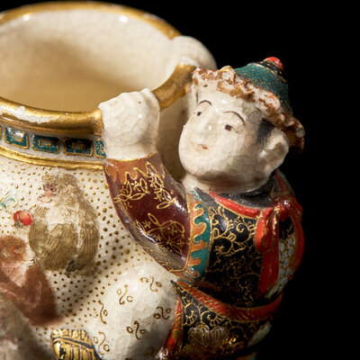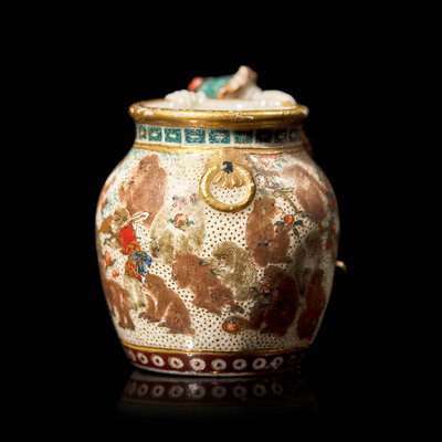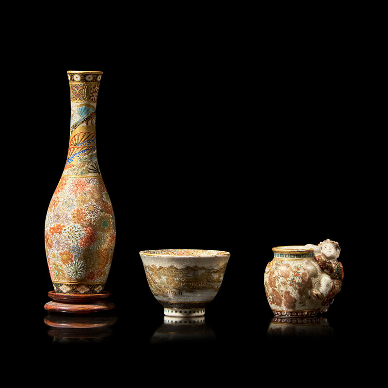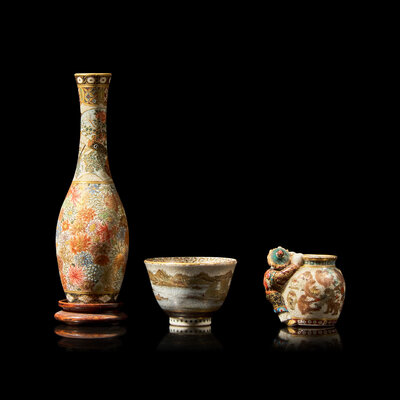 A Small Satsuma-Type Cabinet Vase, a Figural Miniature Vase, and a Miniature Bowl, All Yabu Meizan, Meiji Period