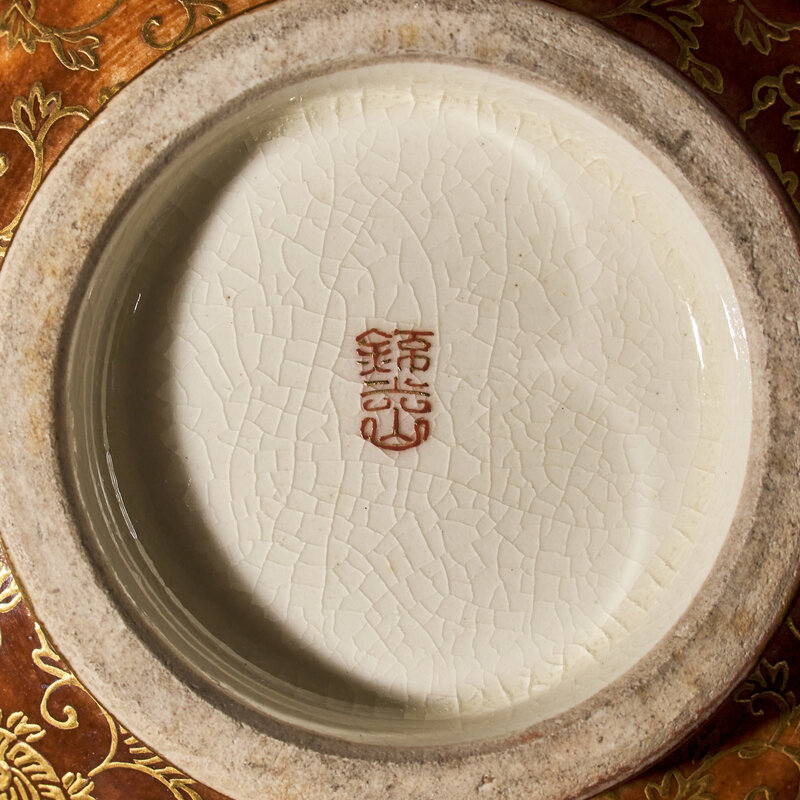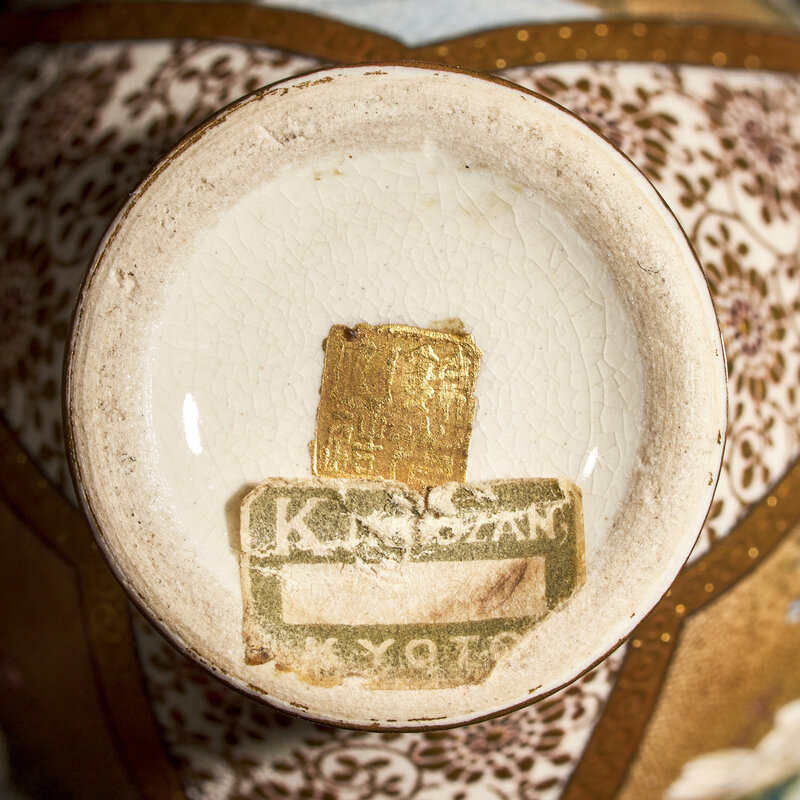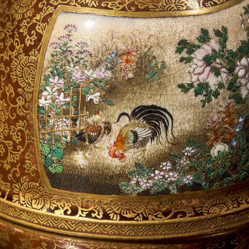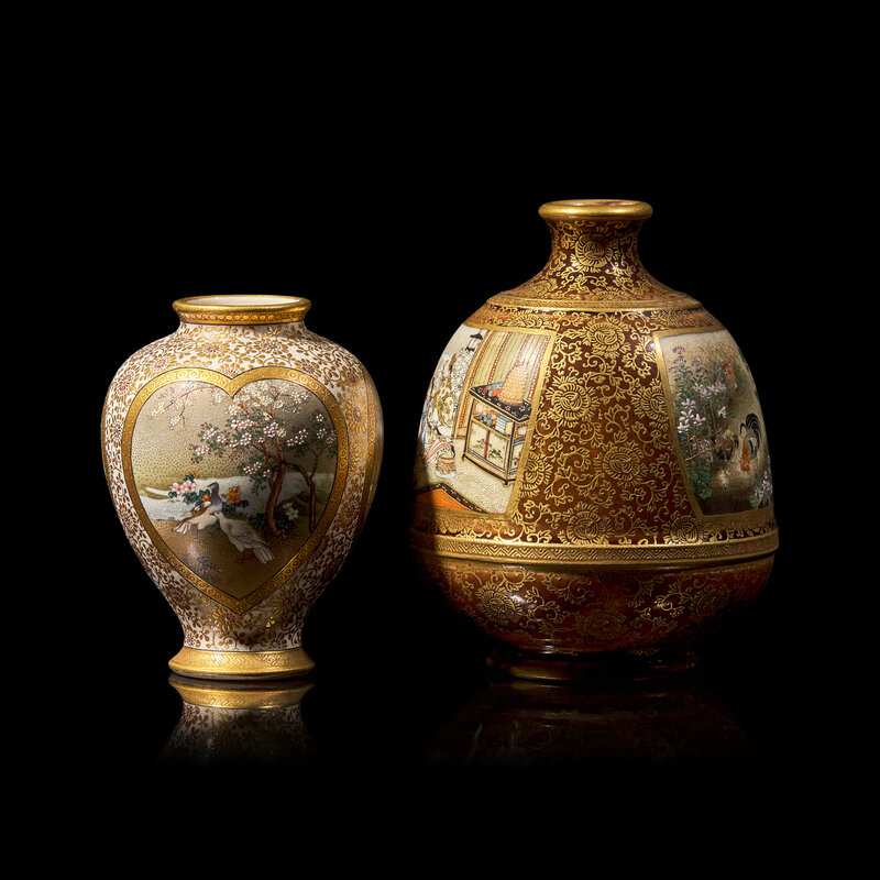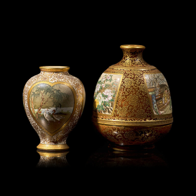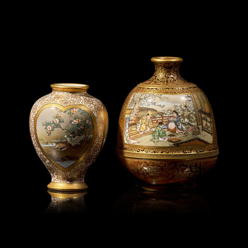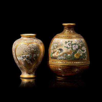 The first of tapered bulbus form, decorated with a hen, cockerel and chicks among flowers; the other reserve with a family group on a pavilion open to the landscape beyond, all against dense gilt floral scrolls on an unusual glossy amber-brown ground; the other vase tapering to the flared foot, decorated with three heart-shaped reserves depicting birds in a landscape, all against a dense gilt floral ground; undersides of both signed, the second with remnant of a Kinkozan, Kyoto paper label.